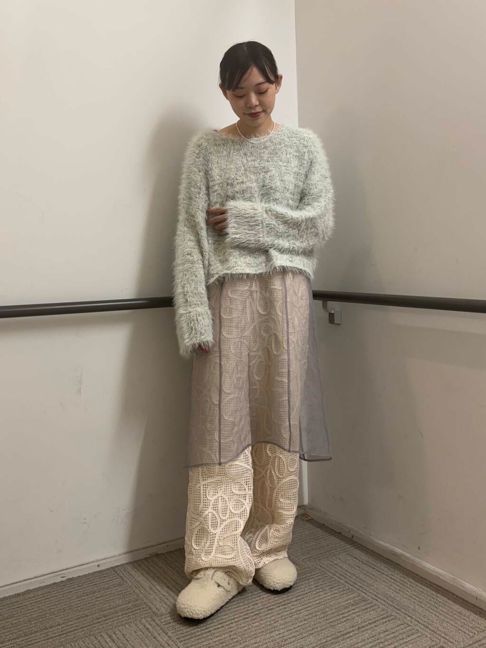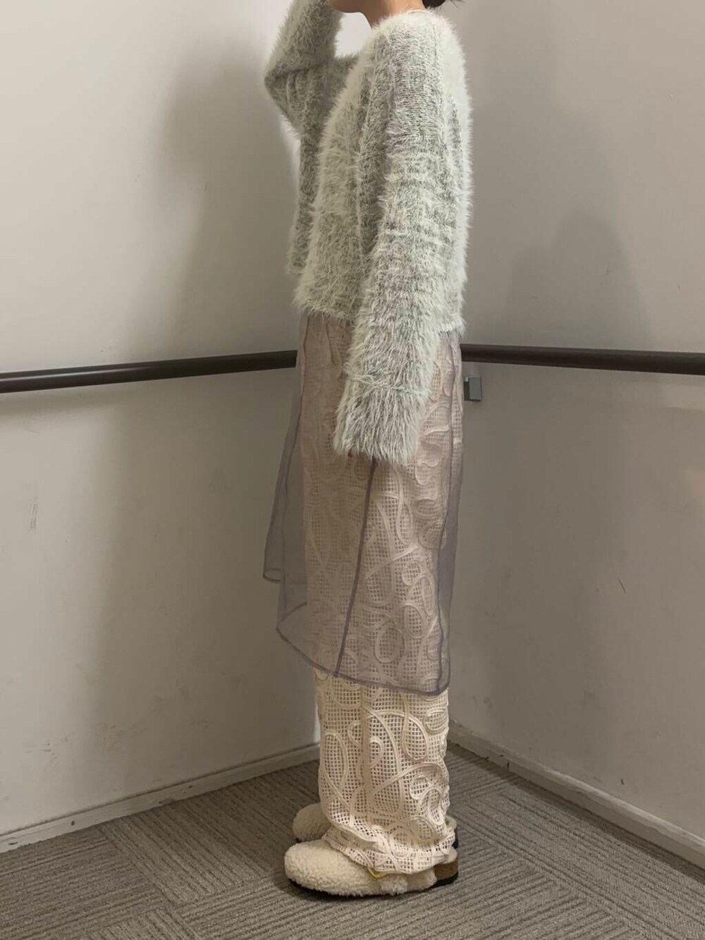 ラメの入ったスラブの糸と毛足のある糸の編みこみニットは、表面感たっぷりな着映えるデザインになっています。