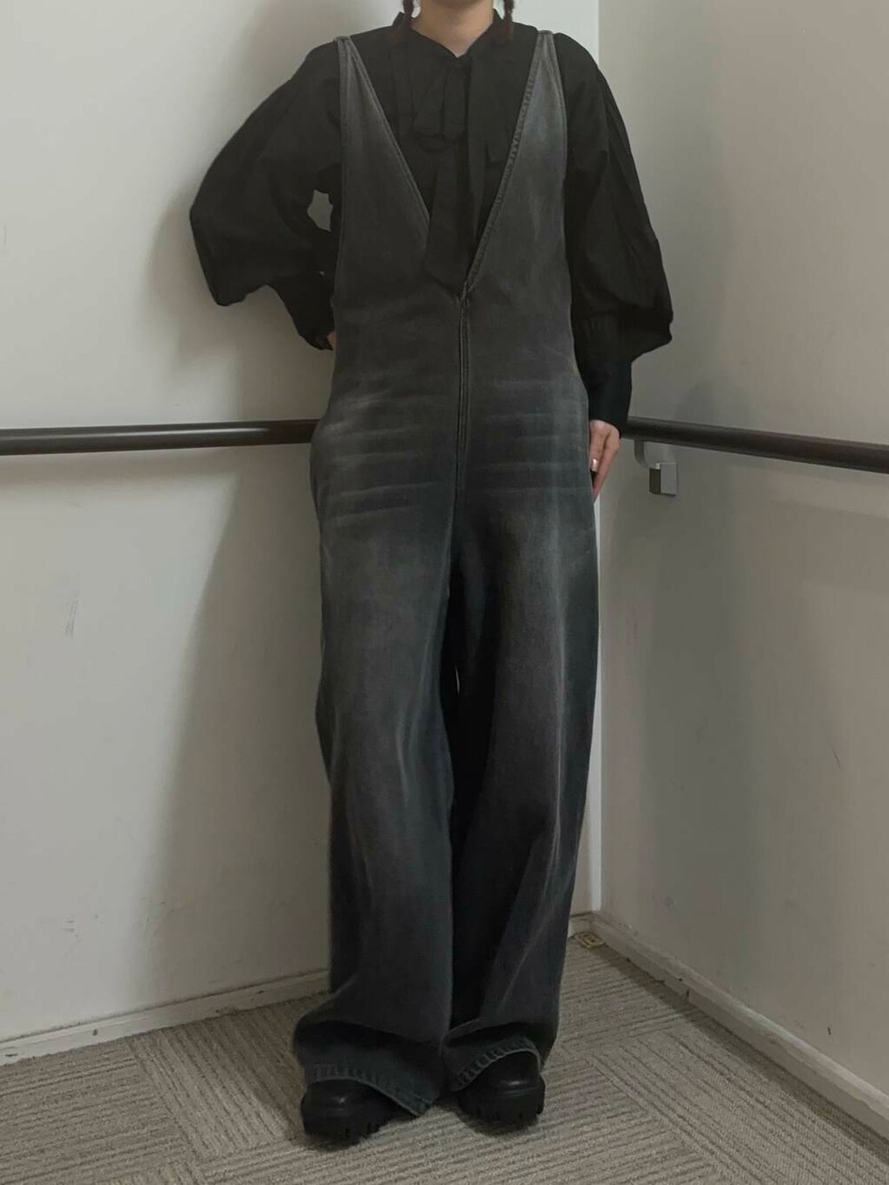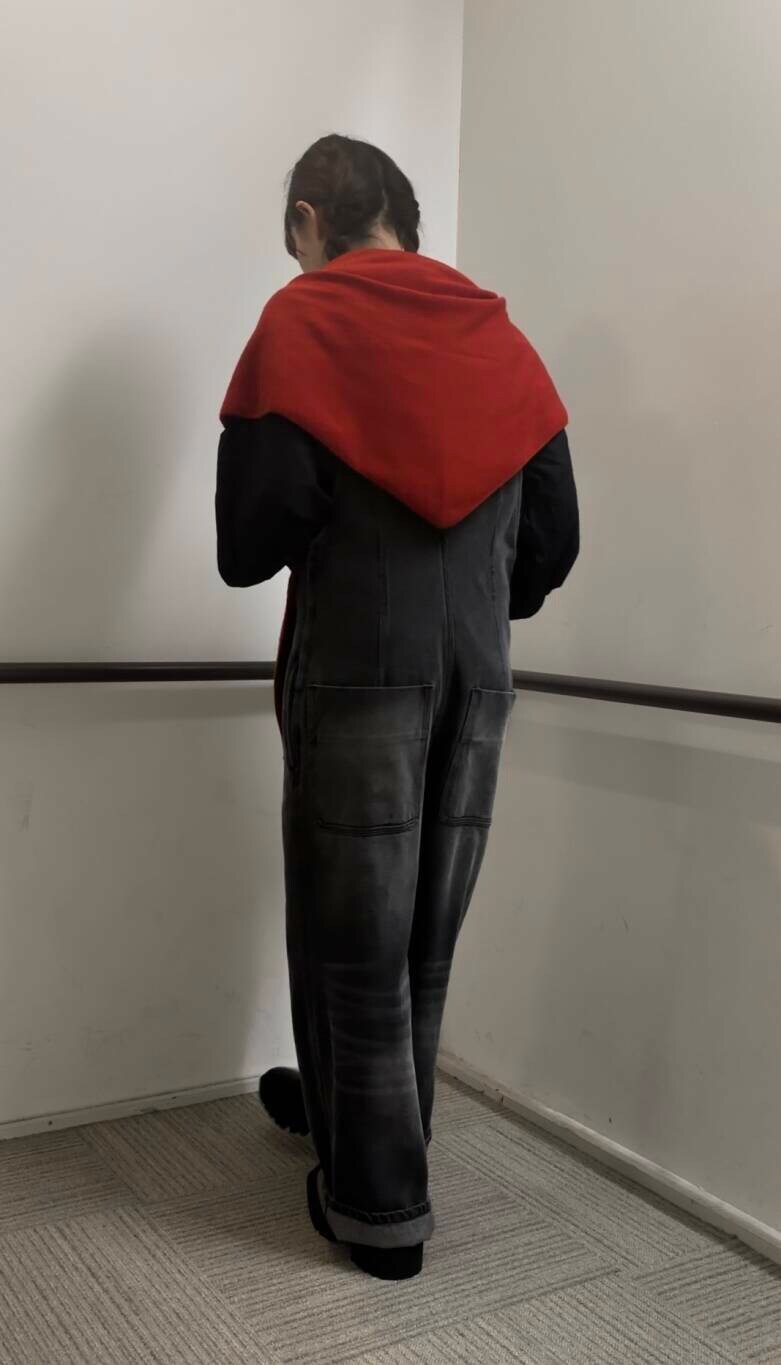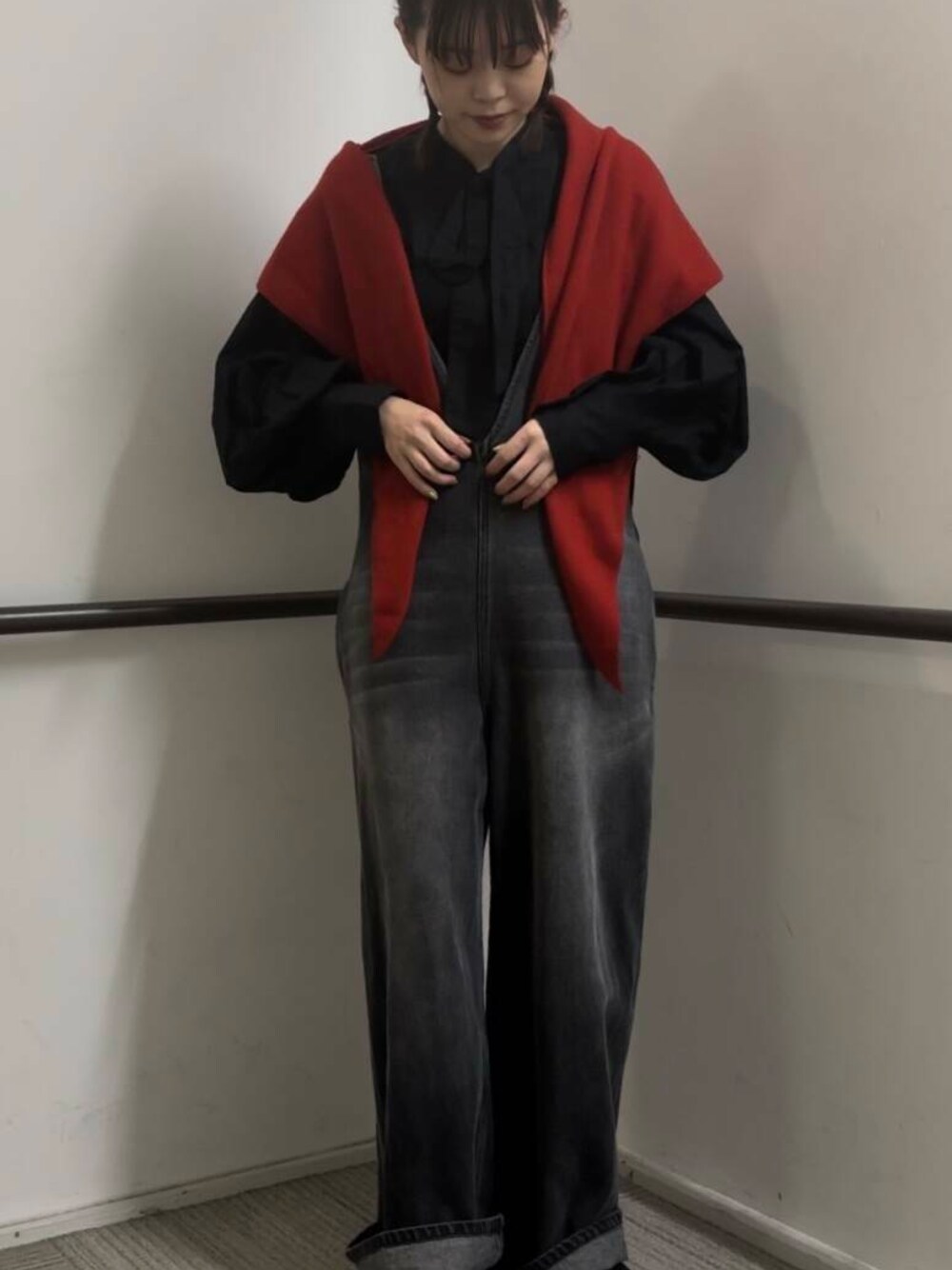 あえて、胸元のリボンが可愛いブラウスが目立つようにVネックデニムサロペットで合わせました!差し色としてレッドのウールカシミヤストールを組み合わせました🧣