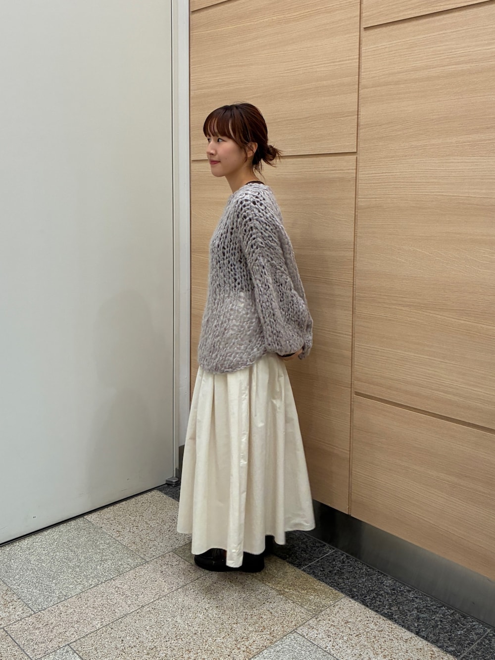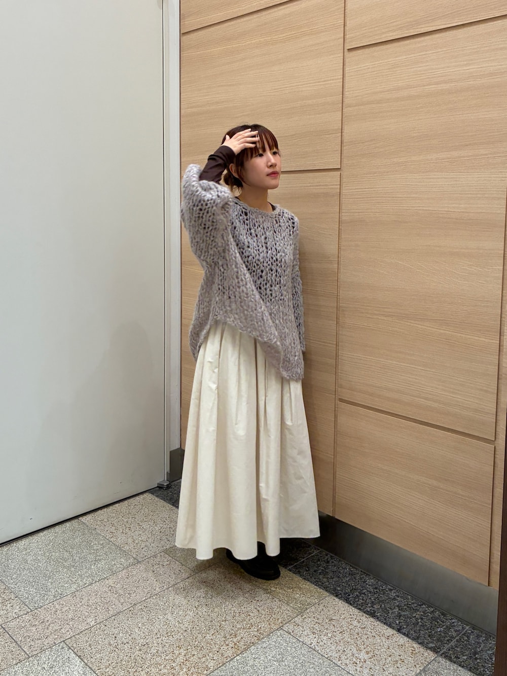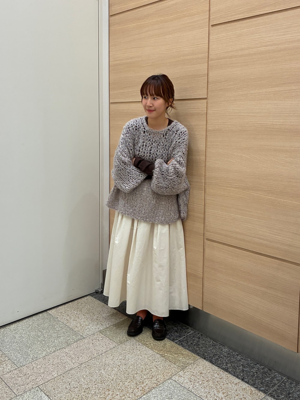 ざっくり編んであるニット。着心地もめちゃくちゃ軽いし、中に色物のインナーを入れて着るのも可愛い( ◠‿◠ )