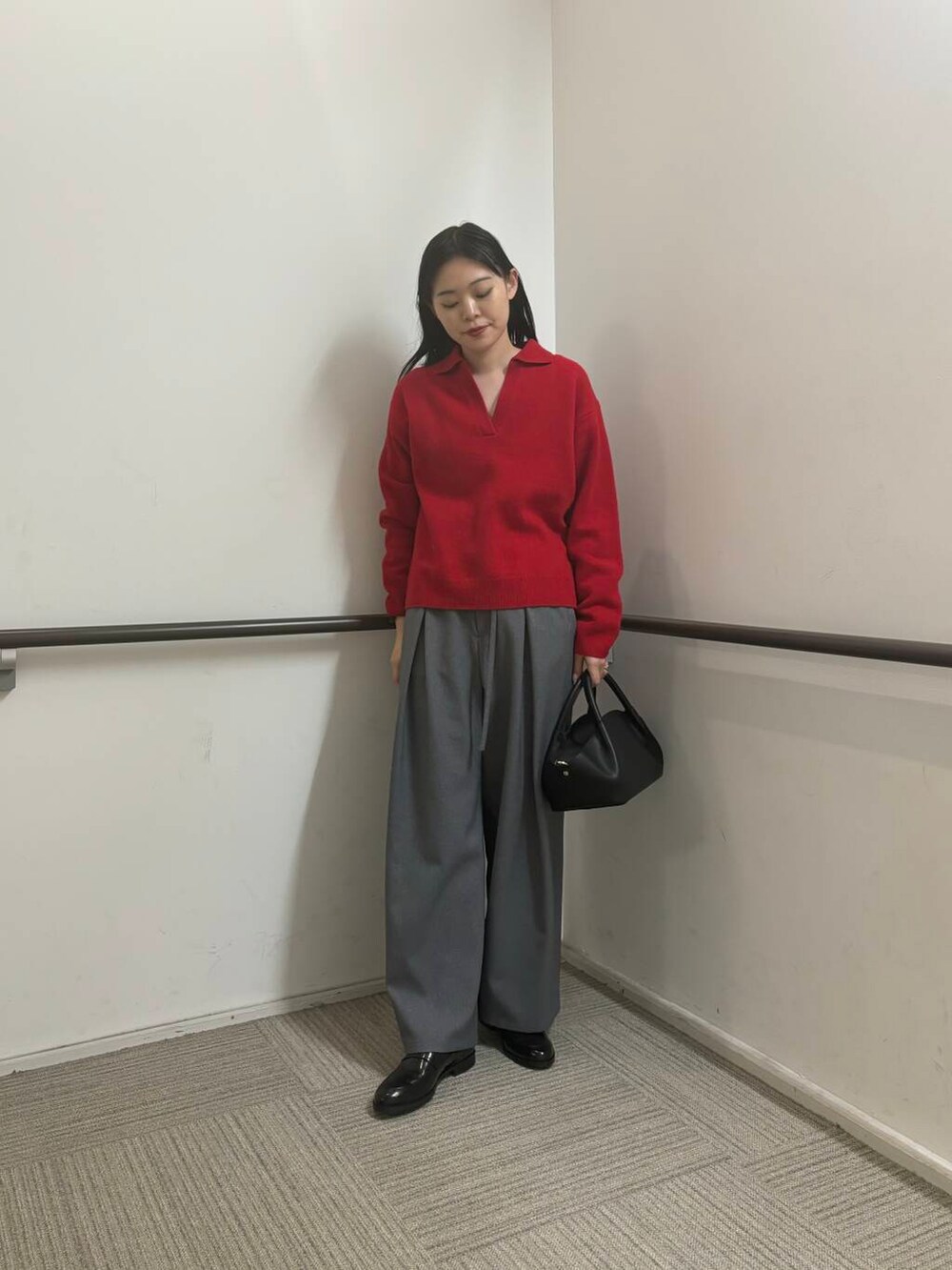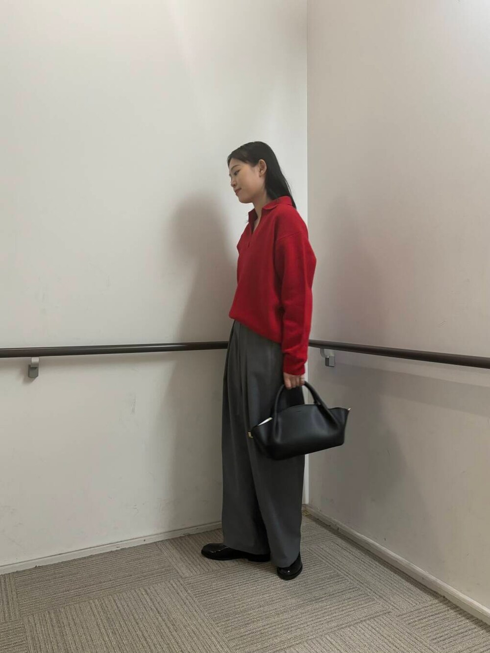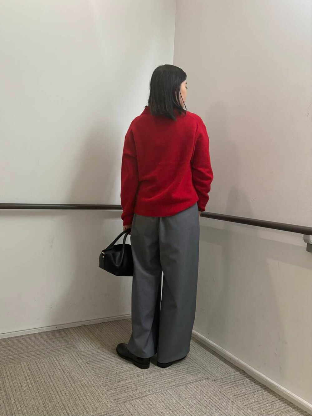 パッとした赤には引き算でグレーパンツを合わせてみました🩶