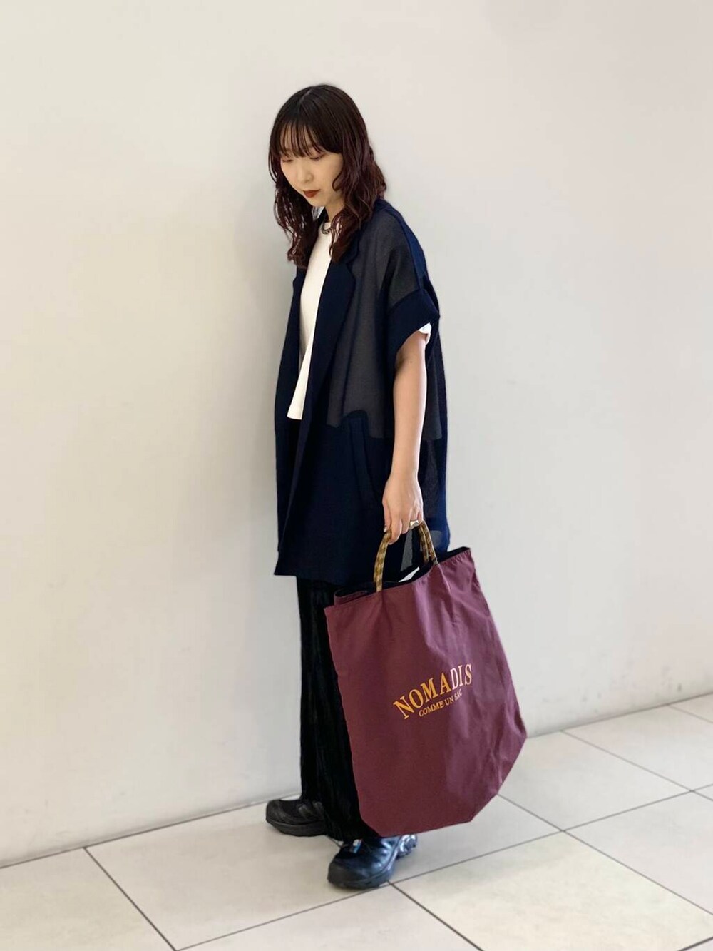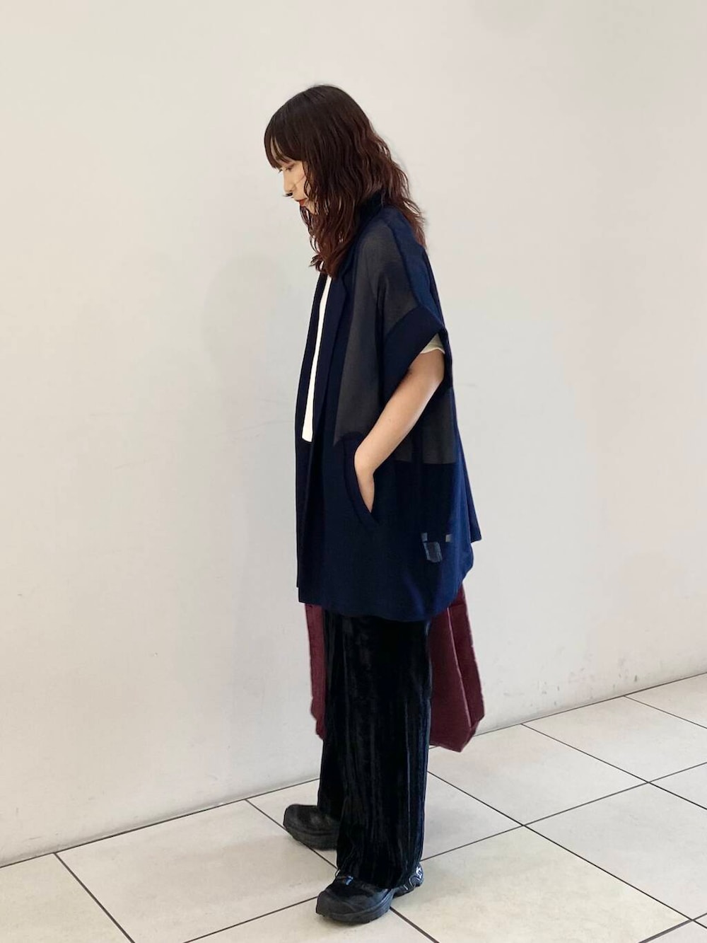 夏らしいジャケットに秋を取り入れたくてベロアパンツを合わせました。