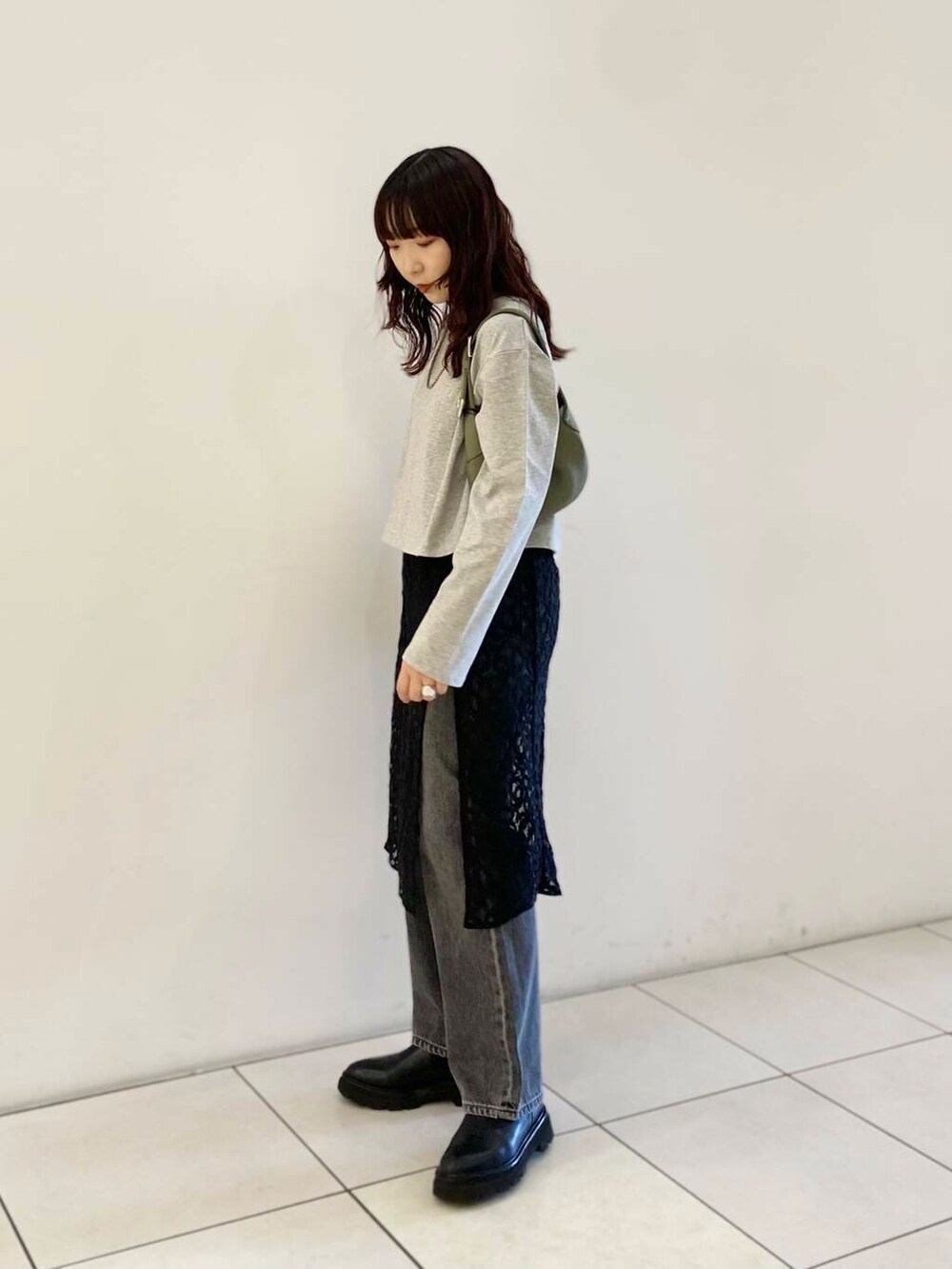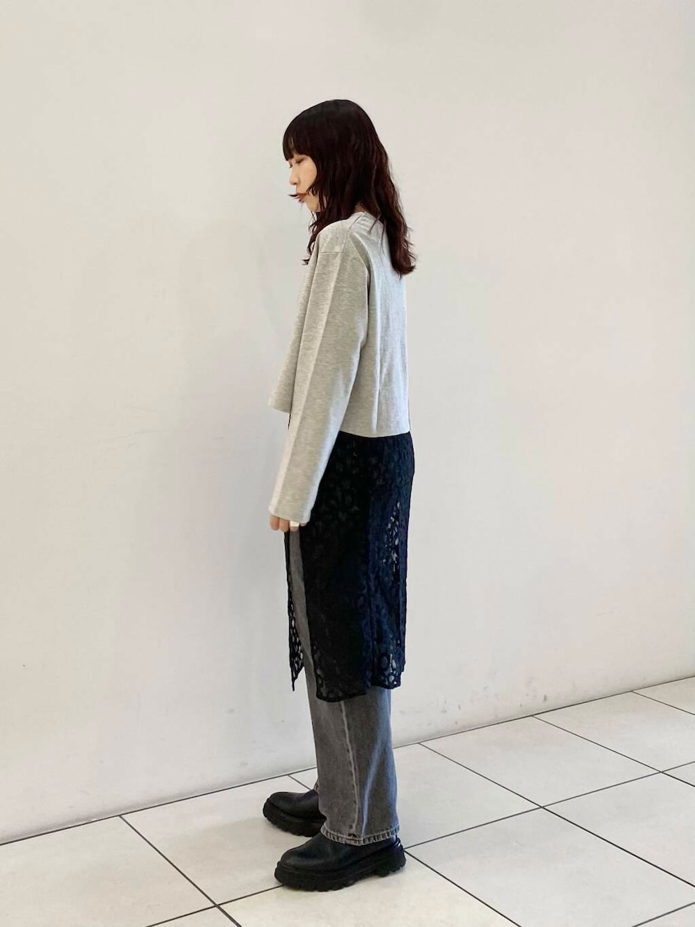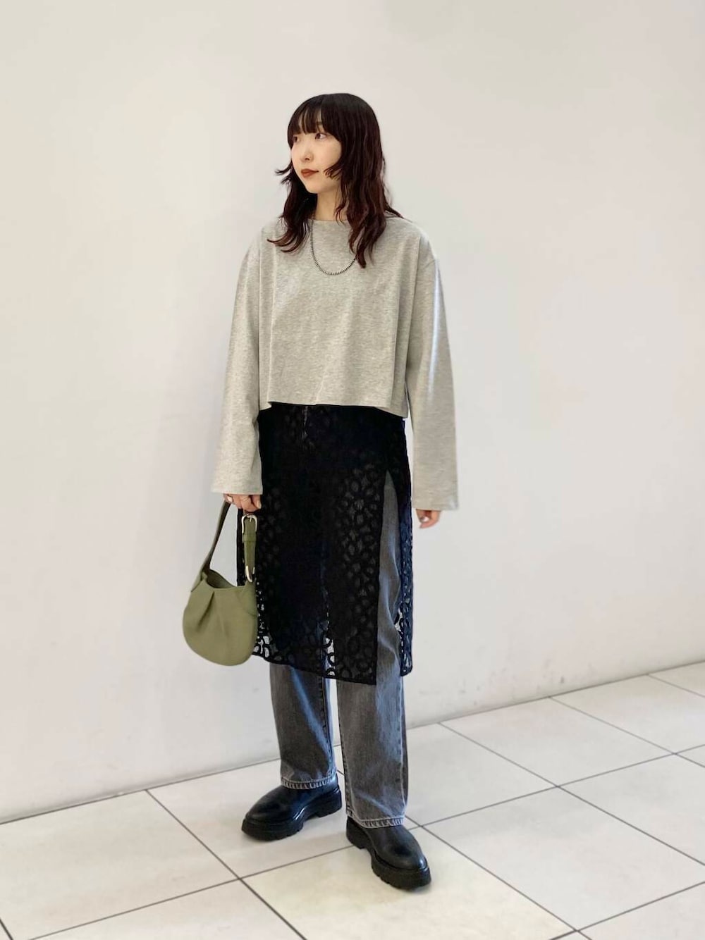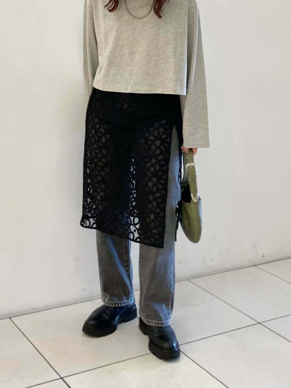 シンプルなスタイリングにレーススカートをポイントでレイヤードしました。