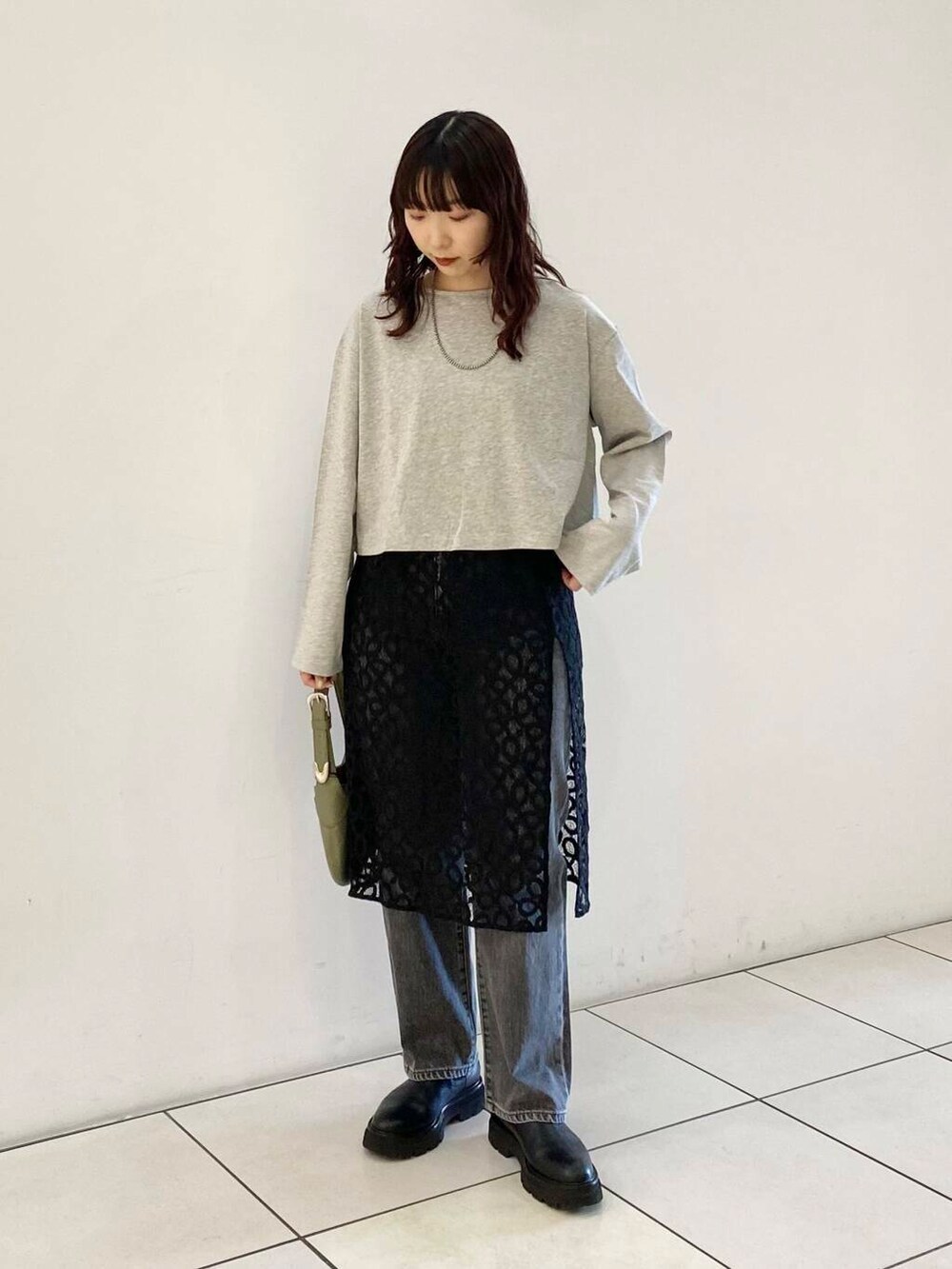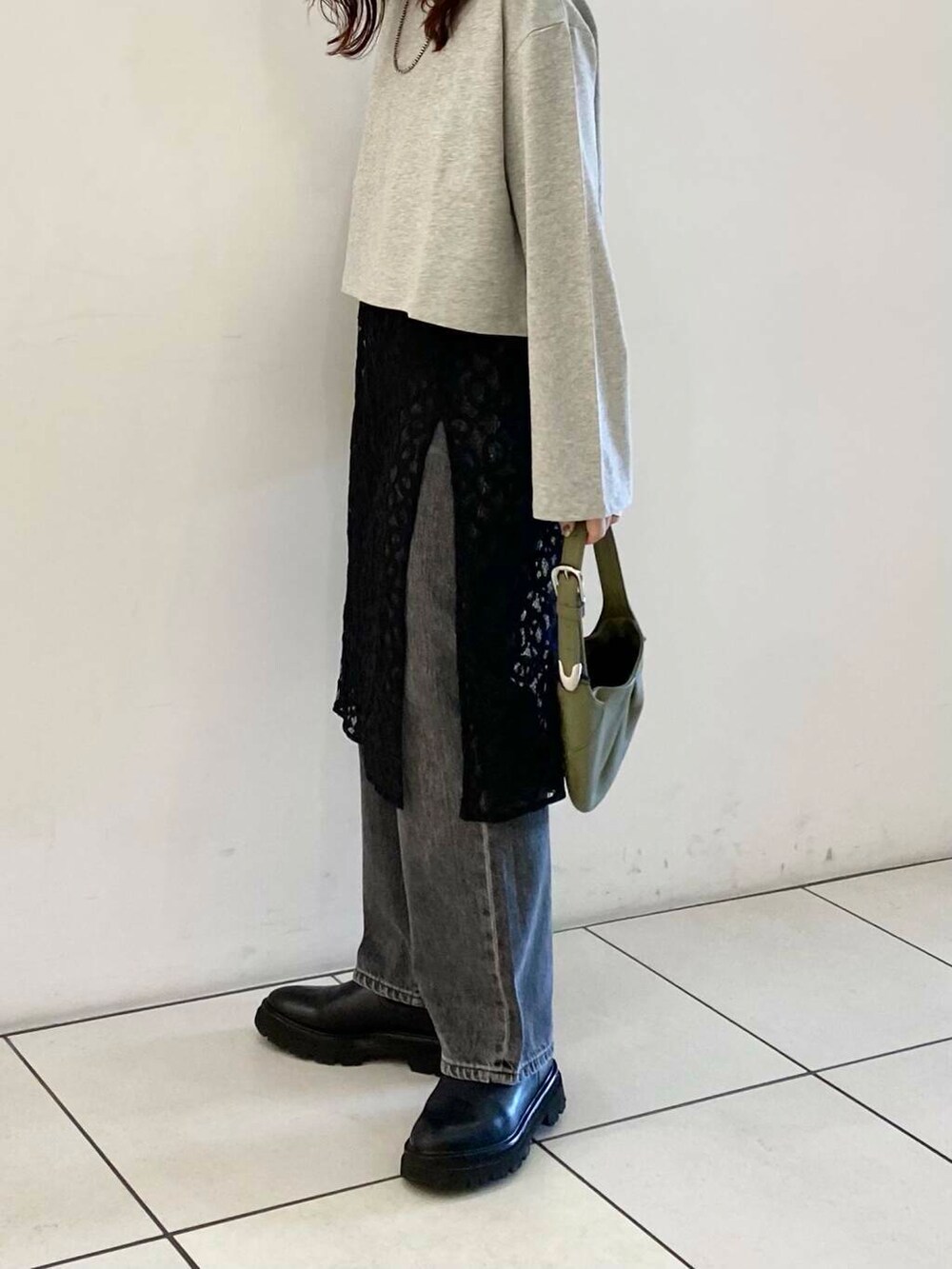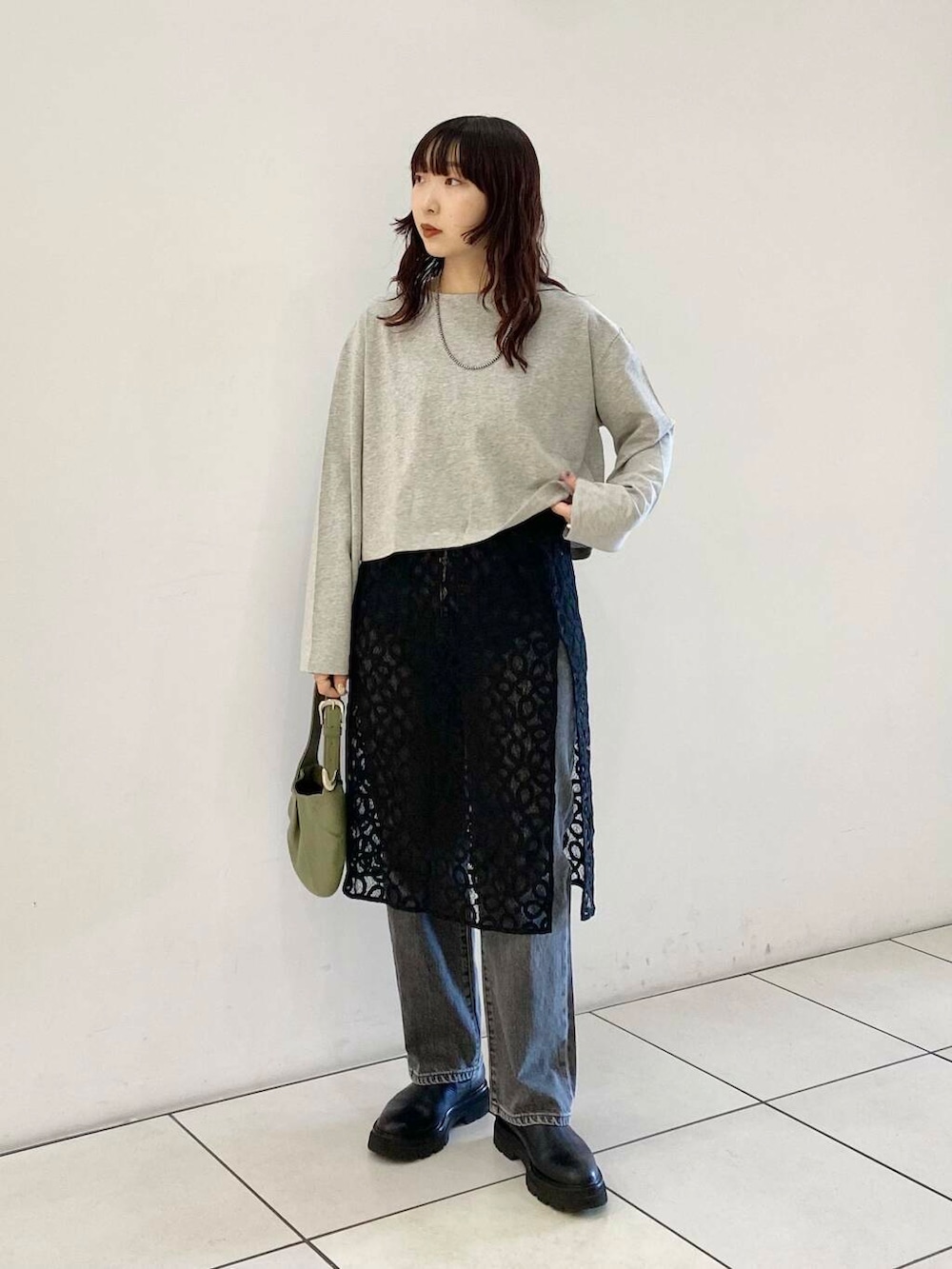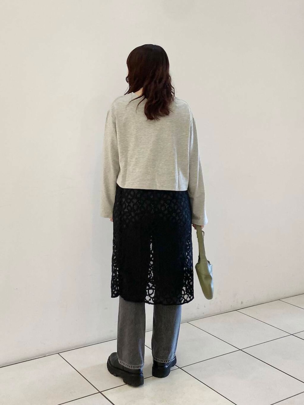 シンプルなスタイリングにレーススカートをポイントでレイヤードしました。
