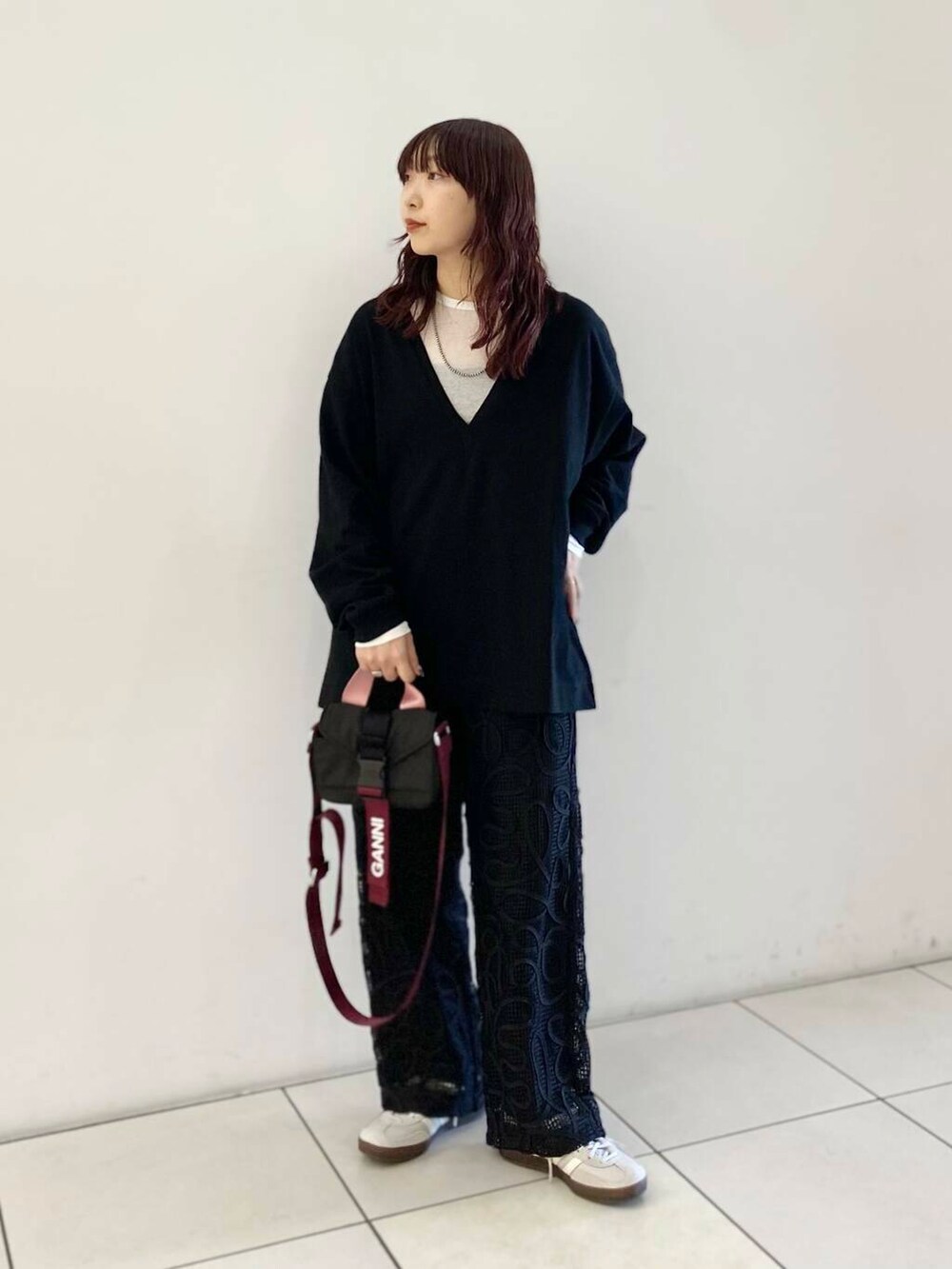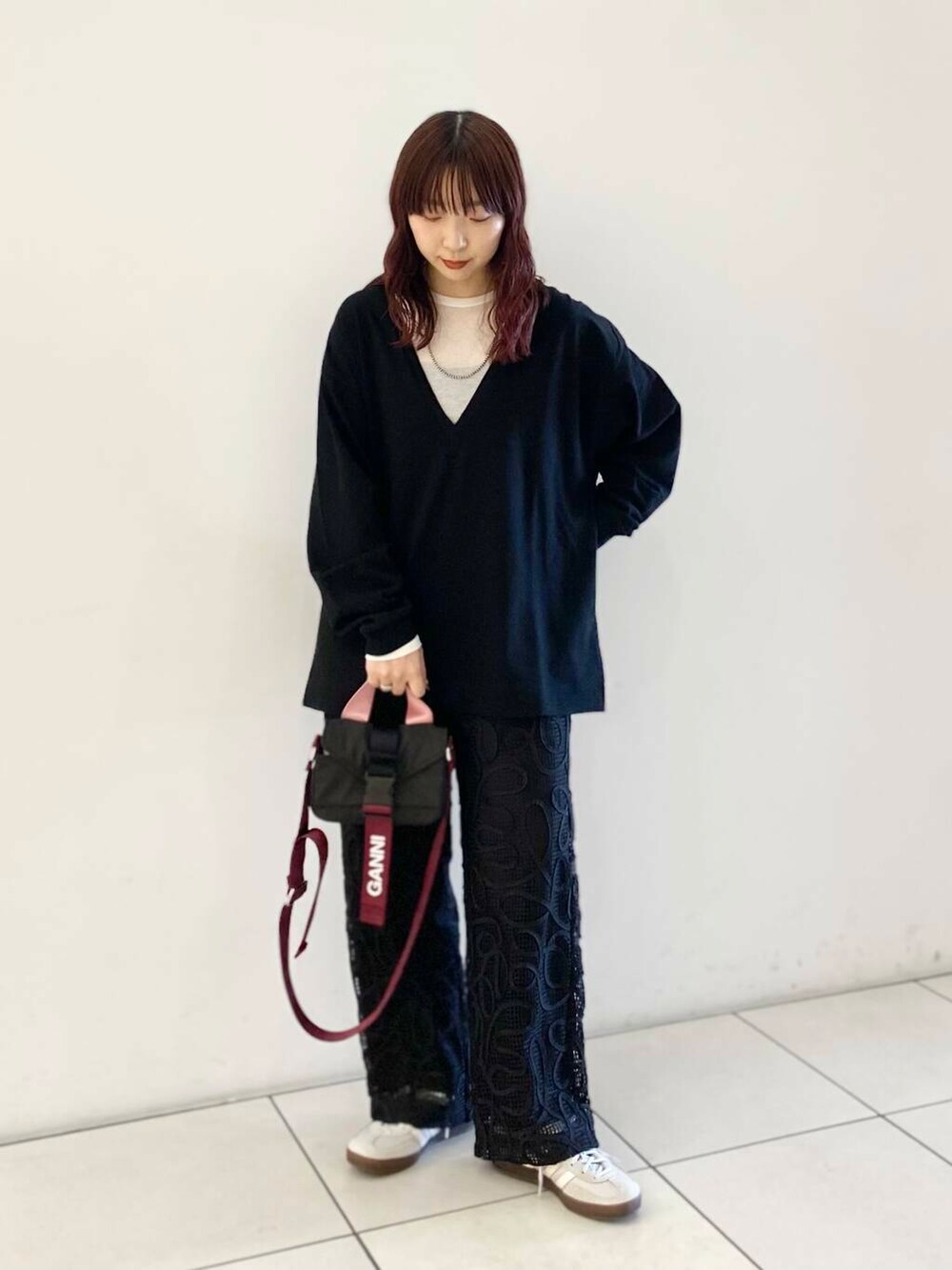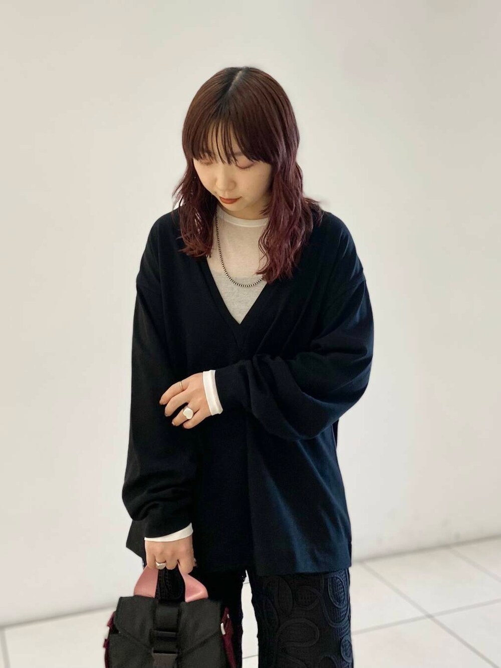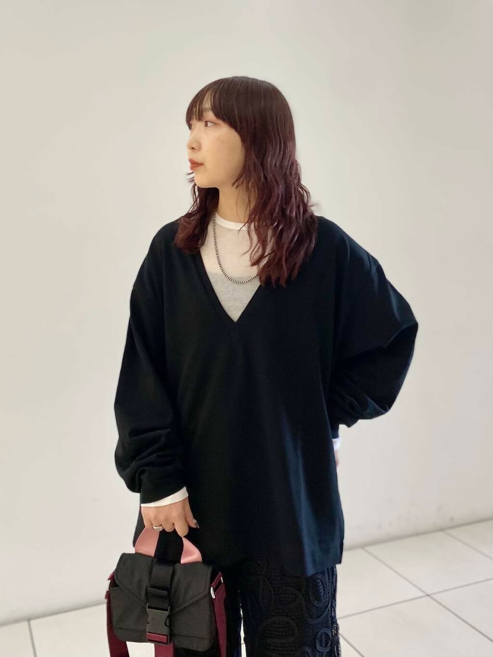 深めのVネックなのでシアーのインナーを重ねました◎