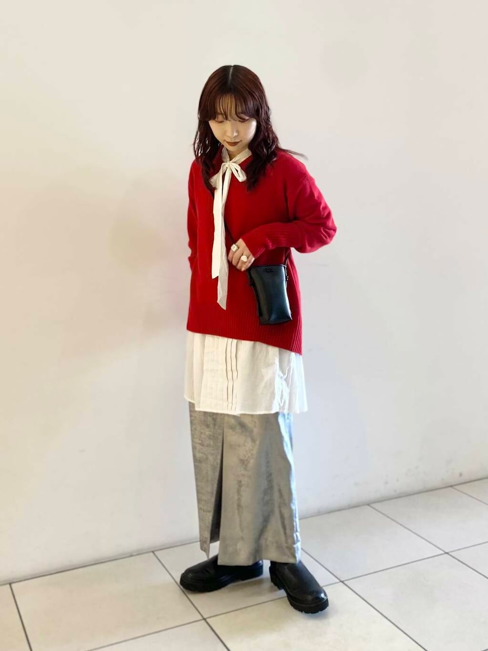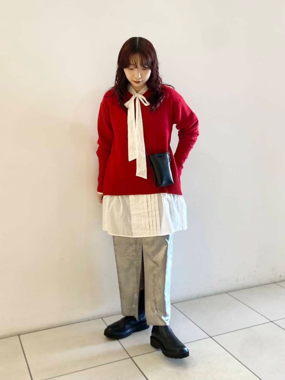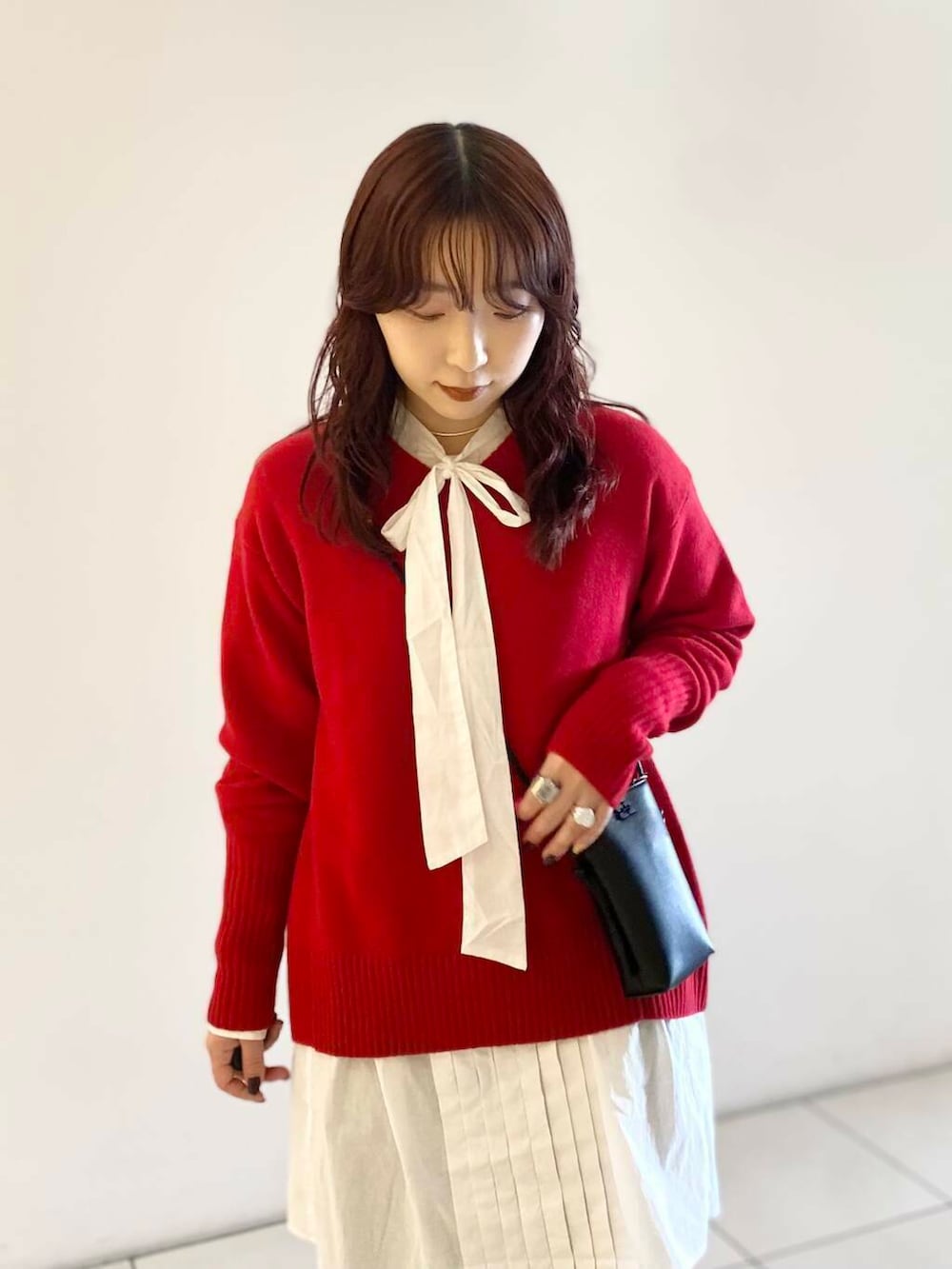 1枚でも可愛いVネックニットにボウタイシャツをレイヤードしました!