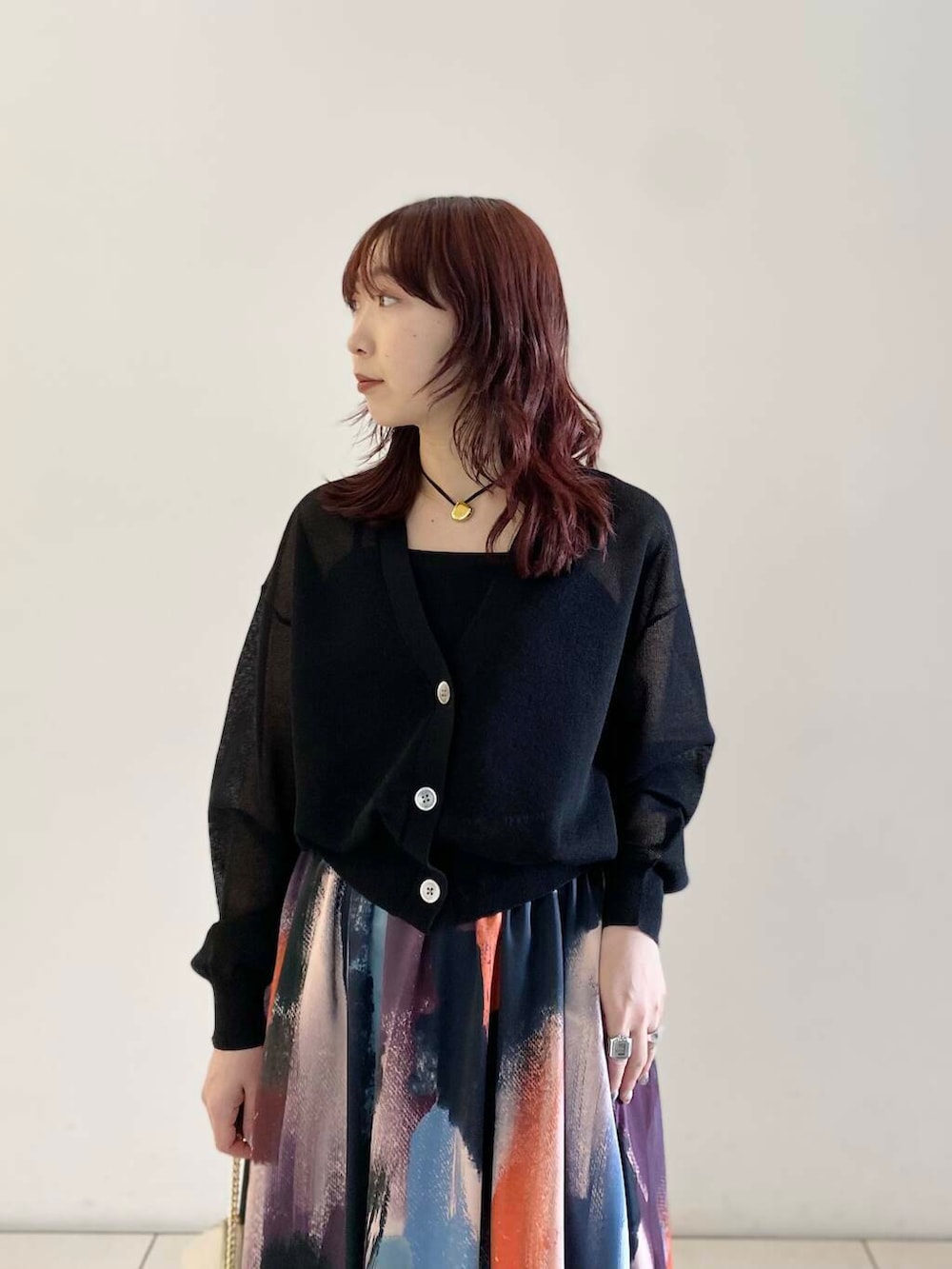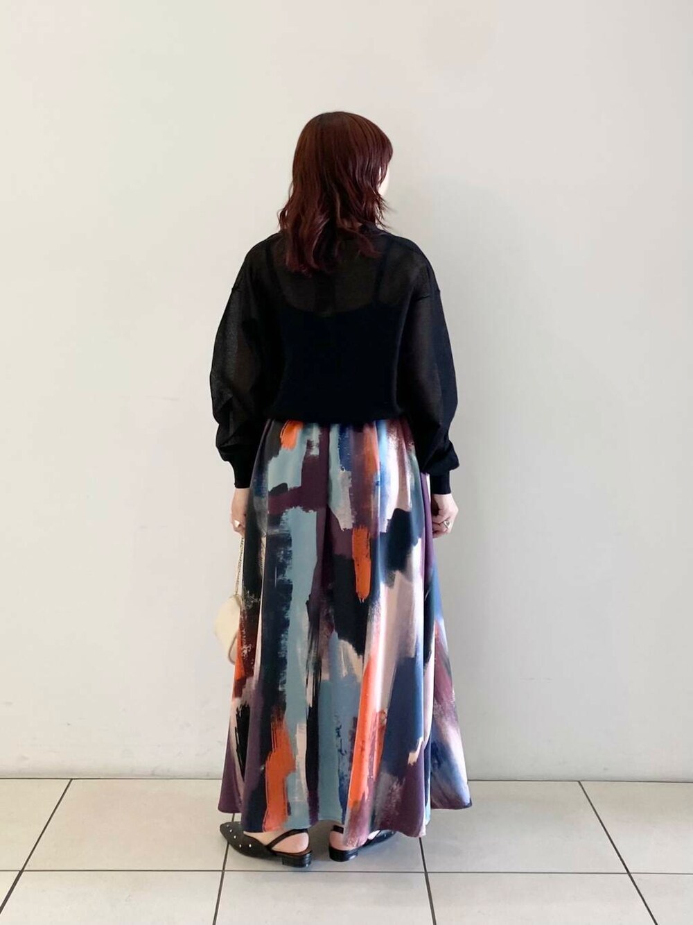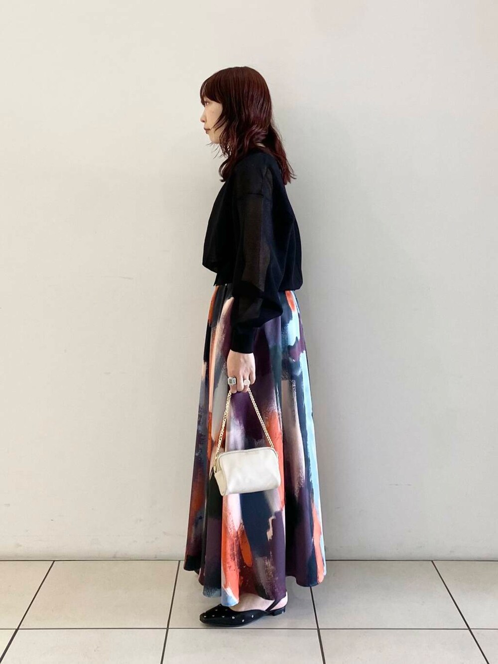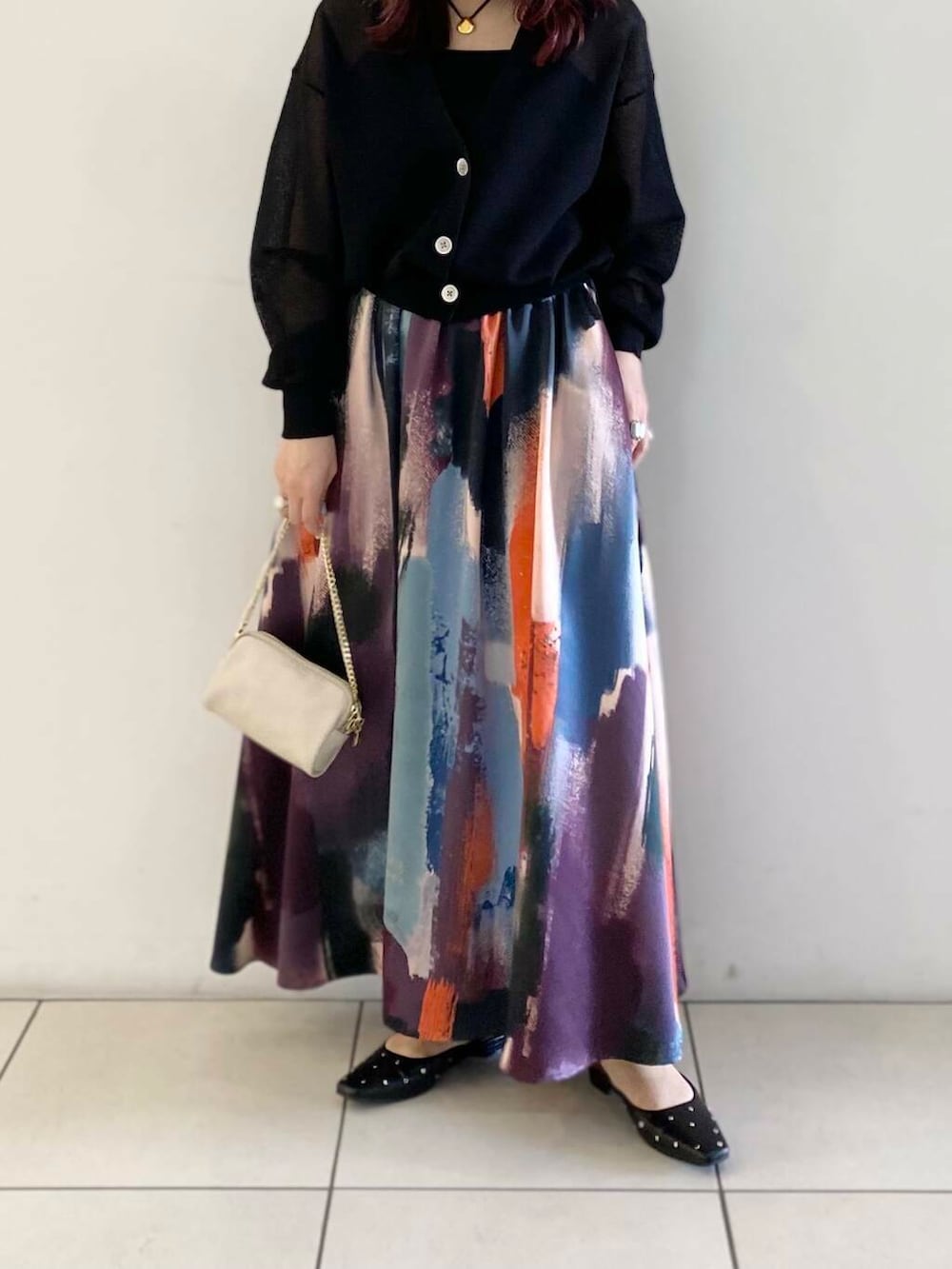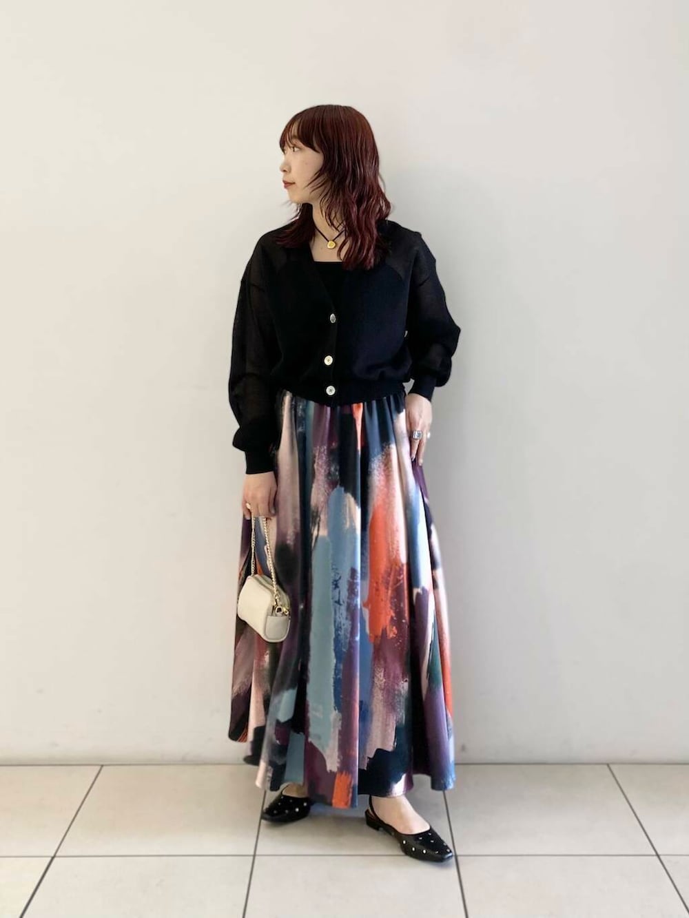 スカートの柄が可愛いので、トップスはシンプルなアイテムで上品に合わせてみました◎