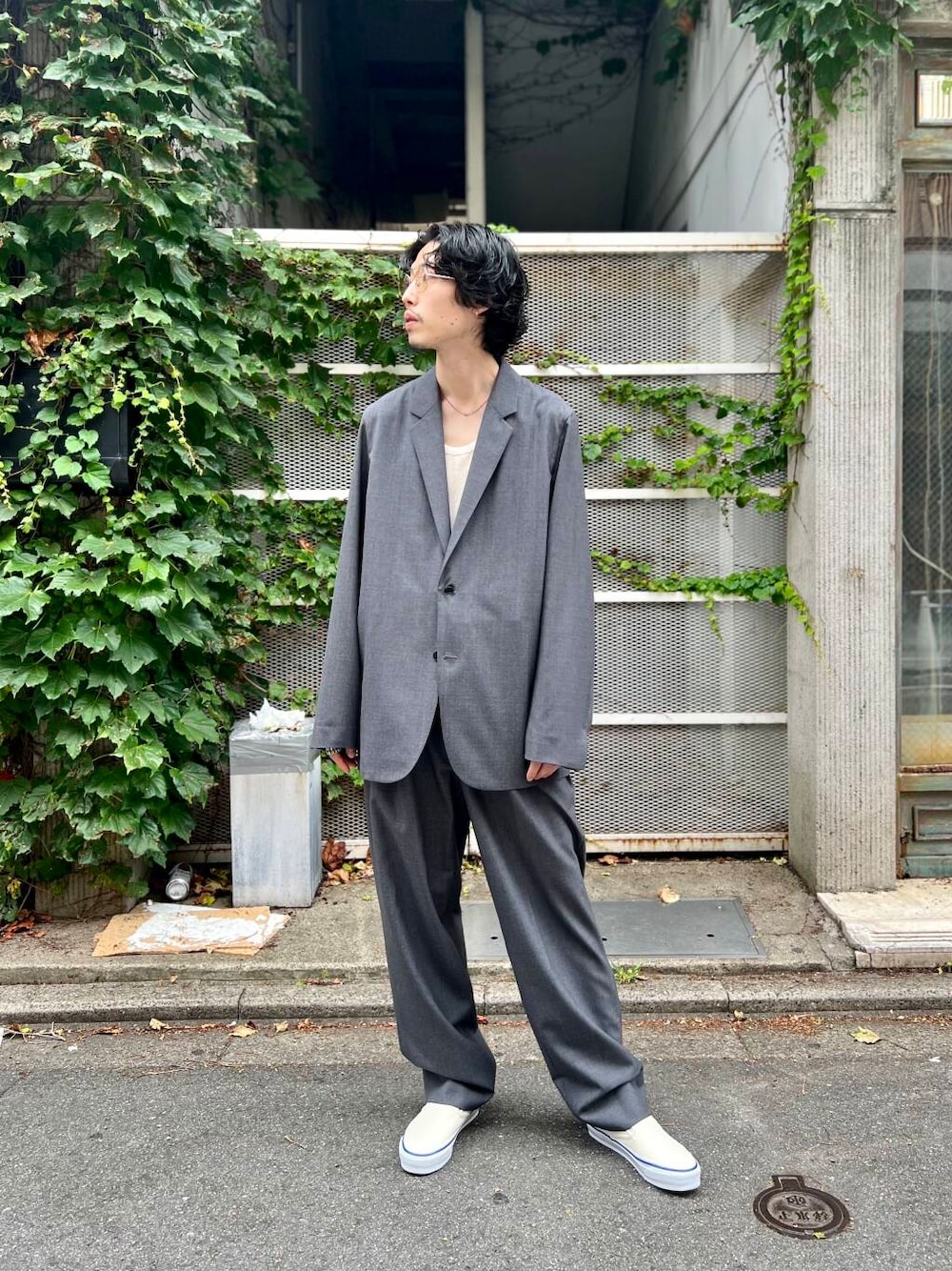 まだ暑い秋でも羽織れるATON独自の気の抜けたサイジング。セットアップでもこの抜け感。流石かと。