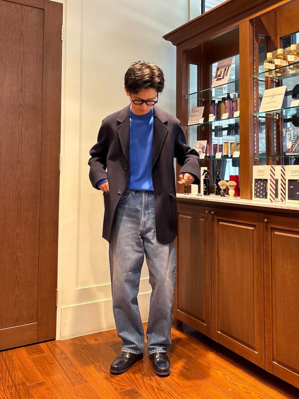 昨日に引き続き全て色相を青で統一したコーデです。個人的にブルーやネイビーハマってます。