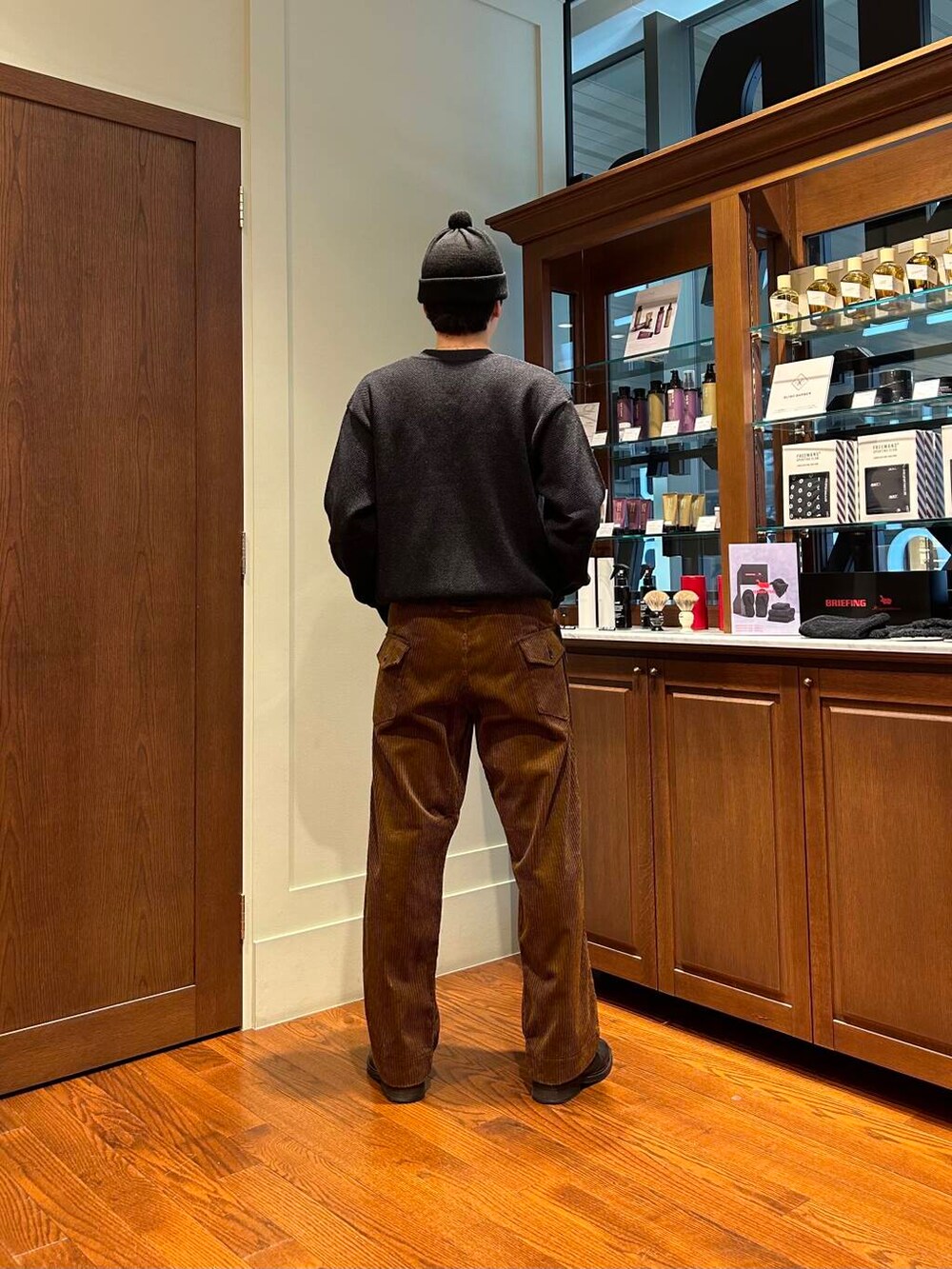 着用しているパンツはフランス製のデッドストックコーデュロイの生地を使ったアイテムになり、男臭さと上品さの対極にあるようなものが上手く組み合わさりwillowpantsにしか出せない雰囲気を出してくれるパンツになっております。
