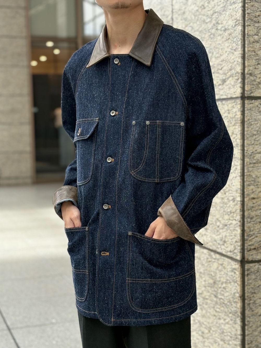 ネップ感にレザーの襟袖切り替え。おまけに長めの着丈に狭めの身幅、かなり迫力があります。1枚で様になる系のジャケットです。