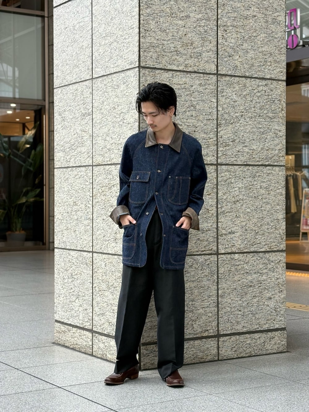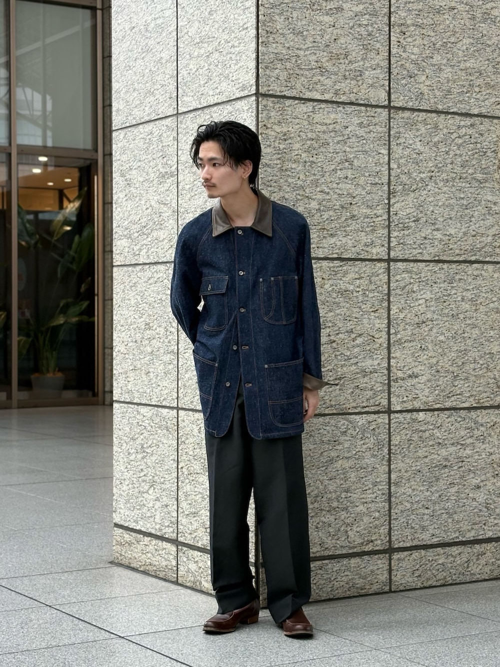 シンプルにスラックスで合わせたいと思いましたが、せっかくなら多素材使いをしたくてシルクコットンのジャケットにウールリネンのスラックスで。