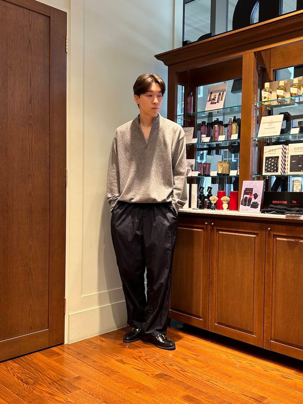 一見シンプルに見えますが、ニットがハーフジップの仕様であったり、合わせるパンツがナイロンであったりとシンプルすぎないスタイリングを組んであげることで見え方が変わってきますので、ぜひ真似してみてください!!