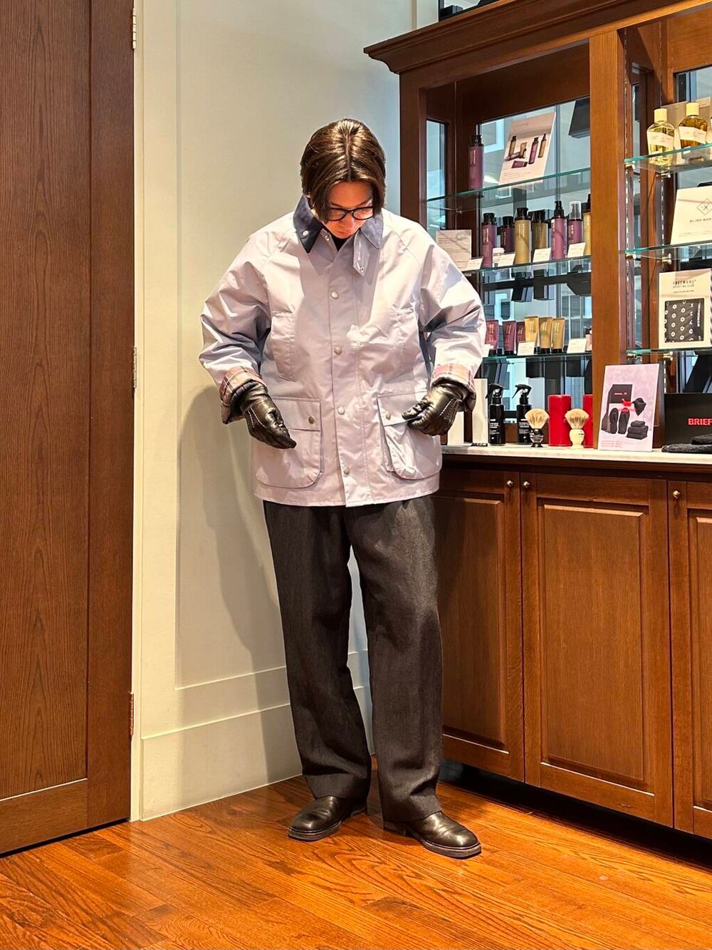 Barbourには珍しいカラーですし、よりファッションに落とし込みやすいのかなと思います。生地も従来のオイルドではなく撥水性のあるナイロン生地を使用し、生地感も色味も最高に良いです!