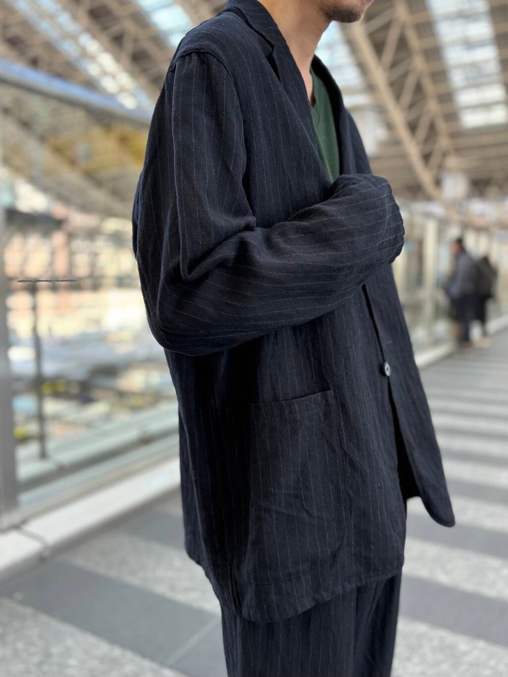 ウールリネンの混紡に、洗いをかけ、さらにもんで、もみくちゃにして、風合いを出した抜群のふっくら感。本来もう少し薄手のこのてのジャケットだとクタッとした生地になるところ、抜群の立体感。より構築的なものとなってます。