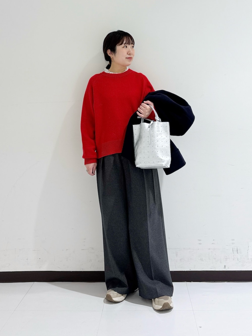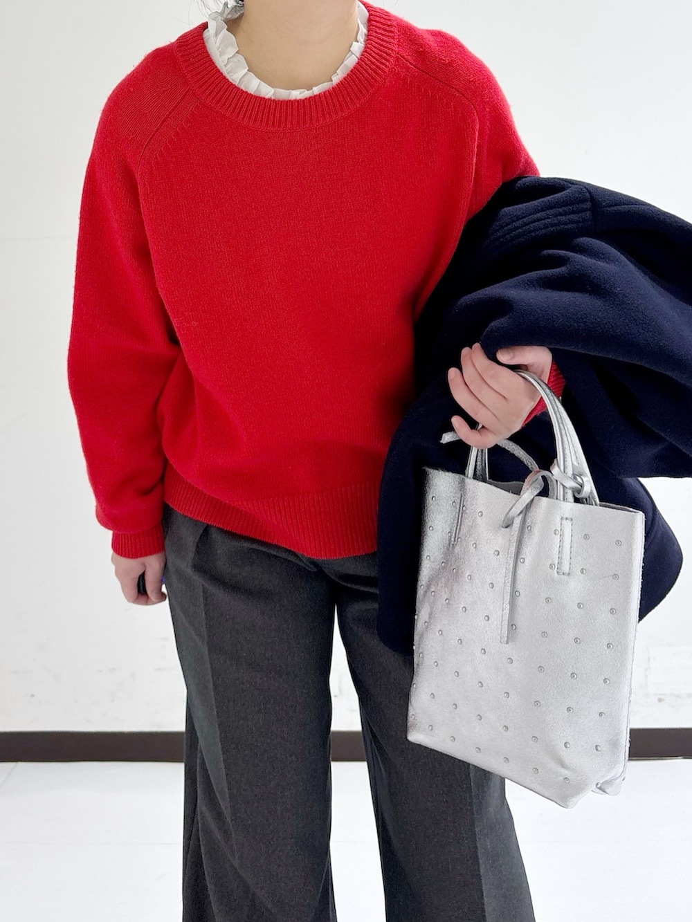 着るだけで気分が上がる赤ニット🧶と新作のフリルカットソーを合わせました😊