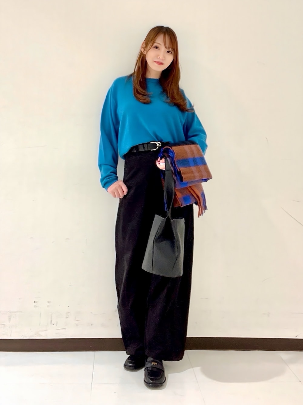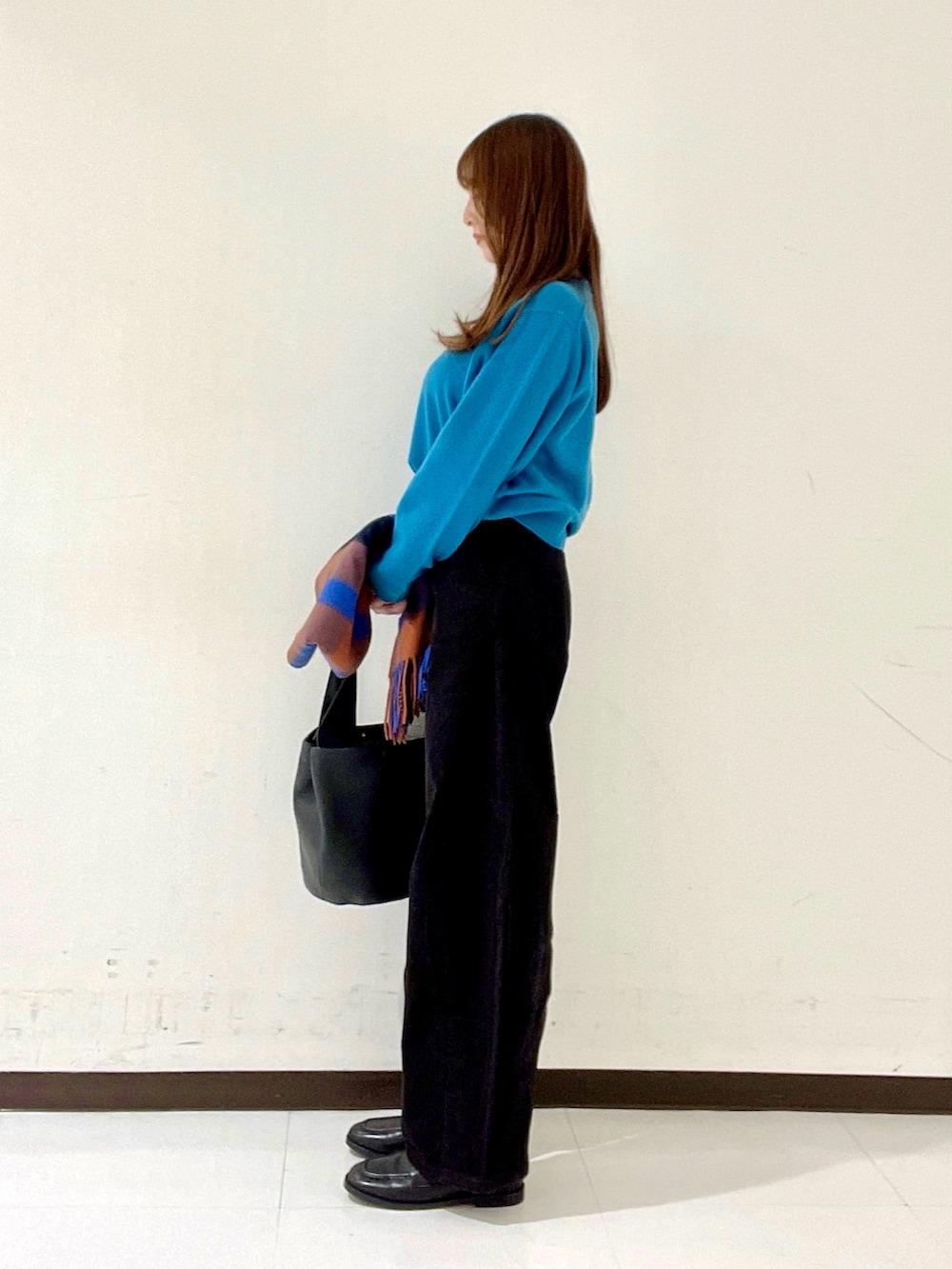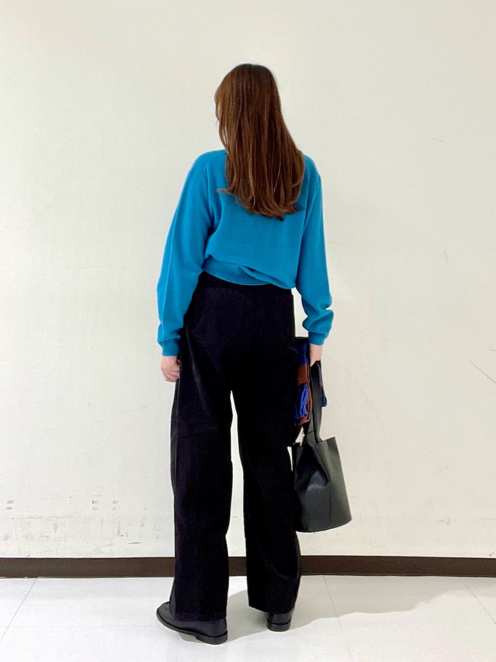 「色合わせが難しそう?」と思われるかもしれませんが、ブラック・ホワイト・ベージュなどの定番カラーともしっかり馴染むので、お手持ちのボトムにも合わせやすいと思います!