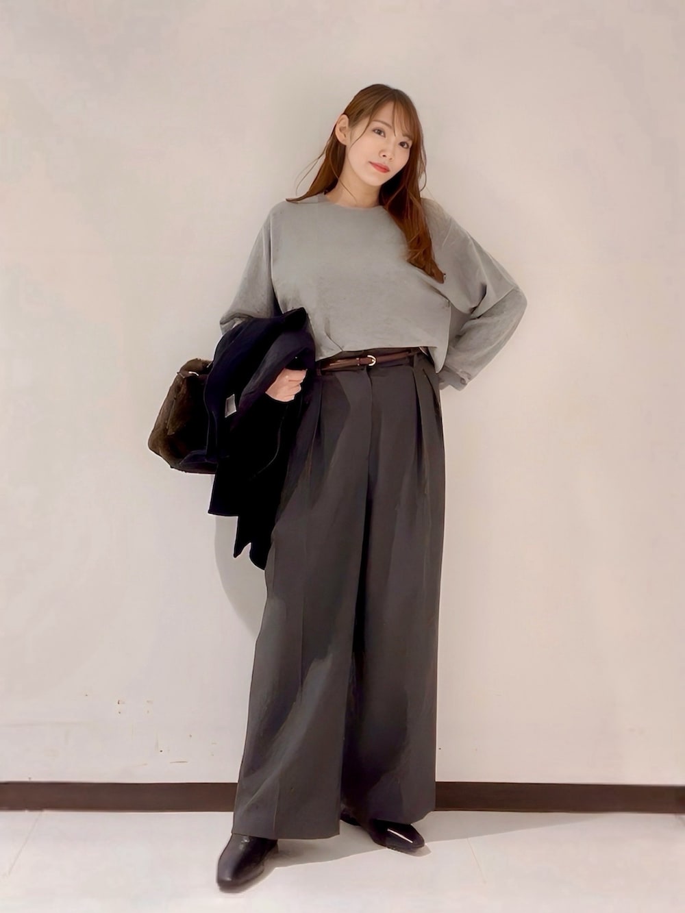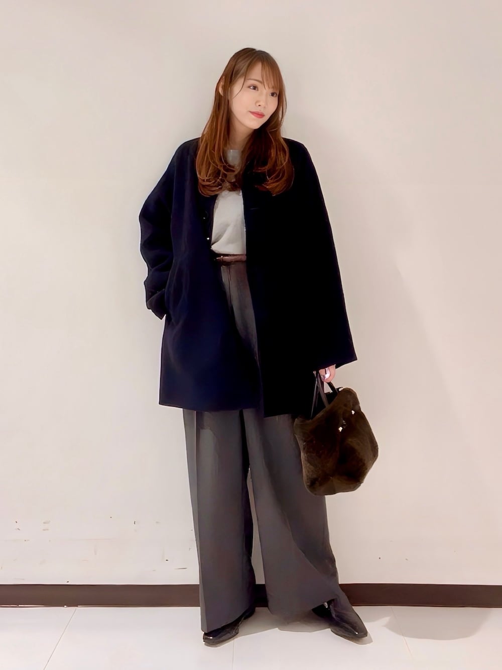 身幅はしっかりゆとりがあり、厚手のニットやジャケットを重ねても窮屈にならないので、気温に合わせて中に着る物で暖かさを調節しやすいです。