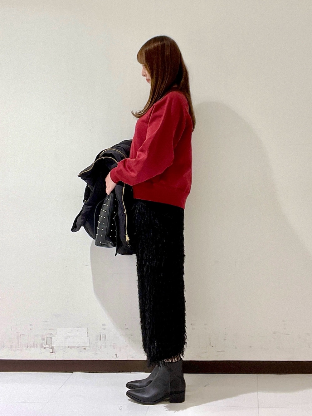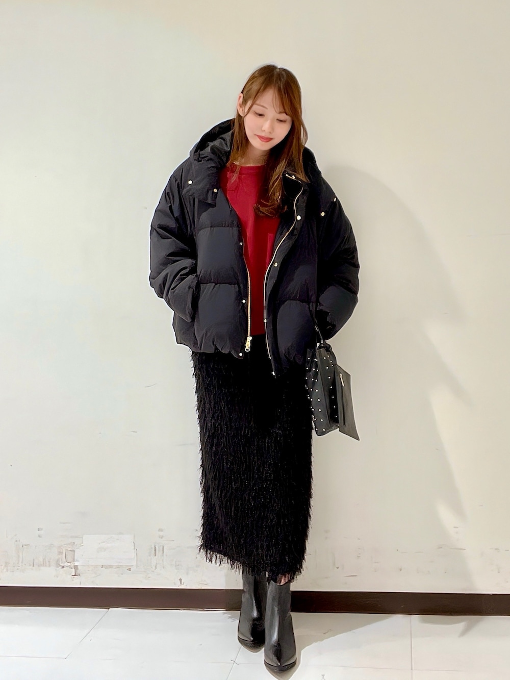 ・ダウンなどで上半身のボリュームが出やすい時は、タイトスカート合わせが間違いないバランスです◎