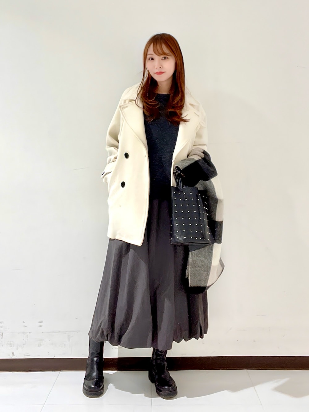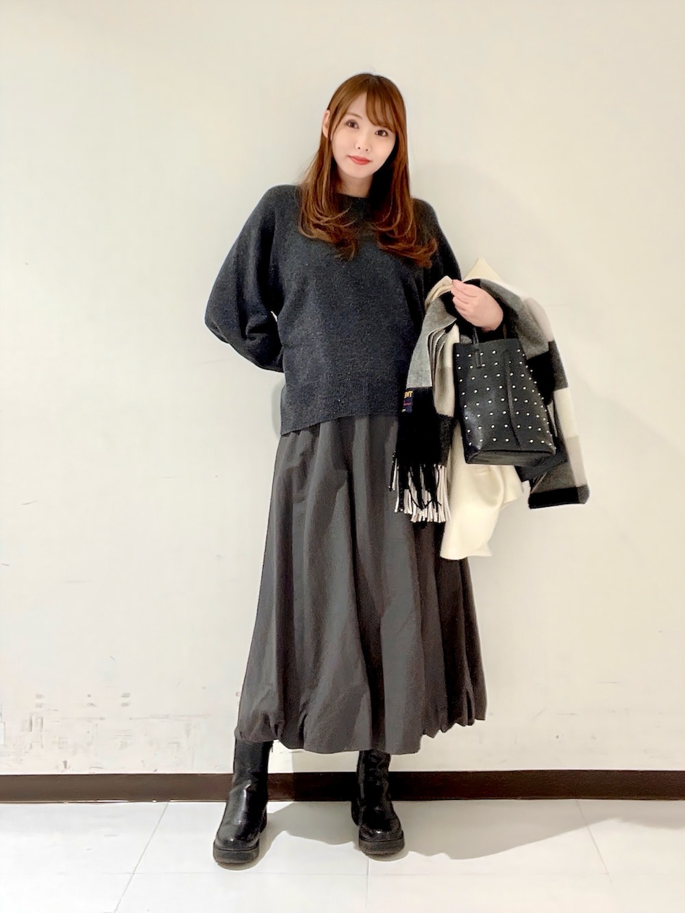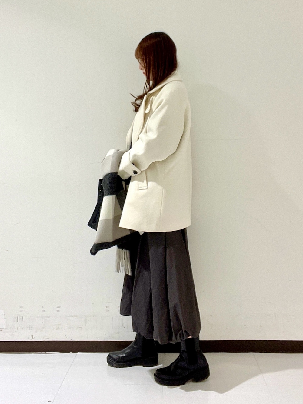 可愛らしい雰囲気のスカートなので、今回はサイドゴアブーツを合わせて甘さ控えめコーデにしました☺️