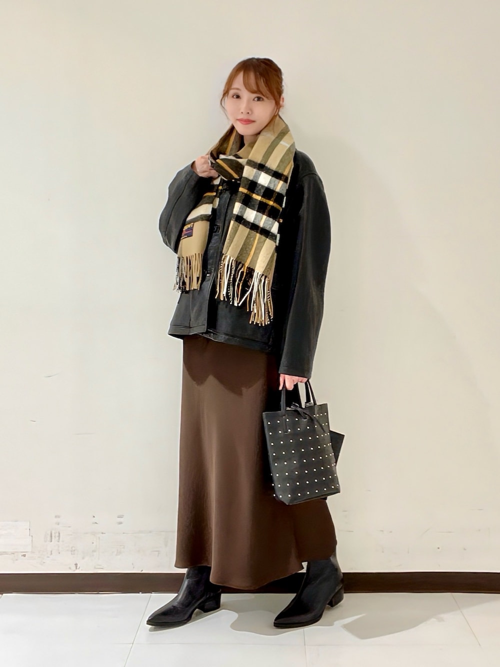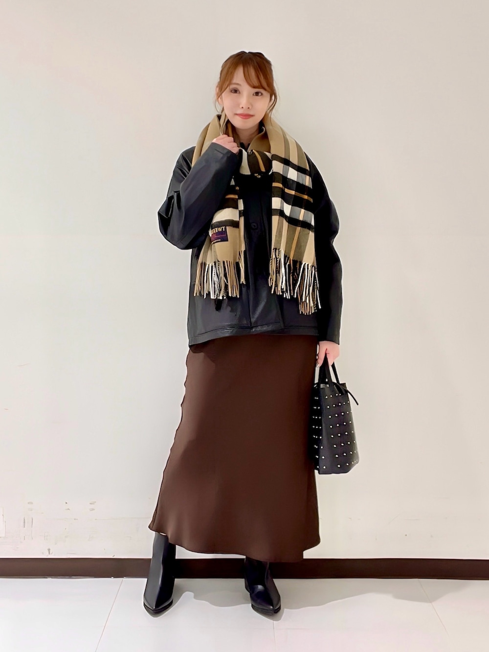 ハードな印象になりがちなレザージャケットも、マフラーを合わせるだけでぐっと柔らかい雰囲気に。