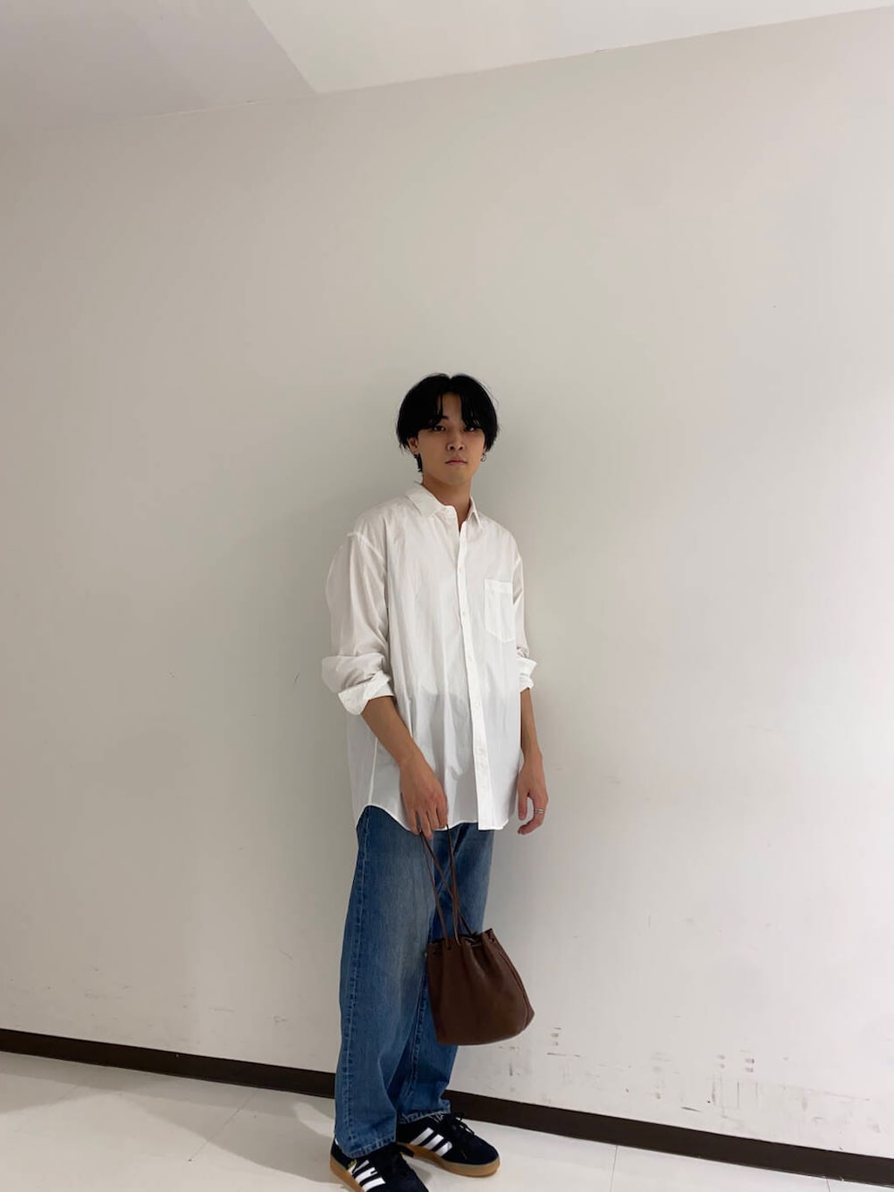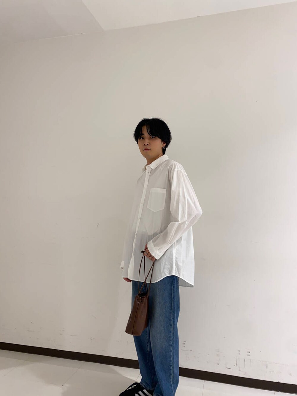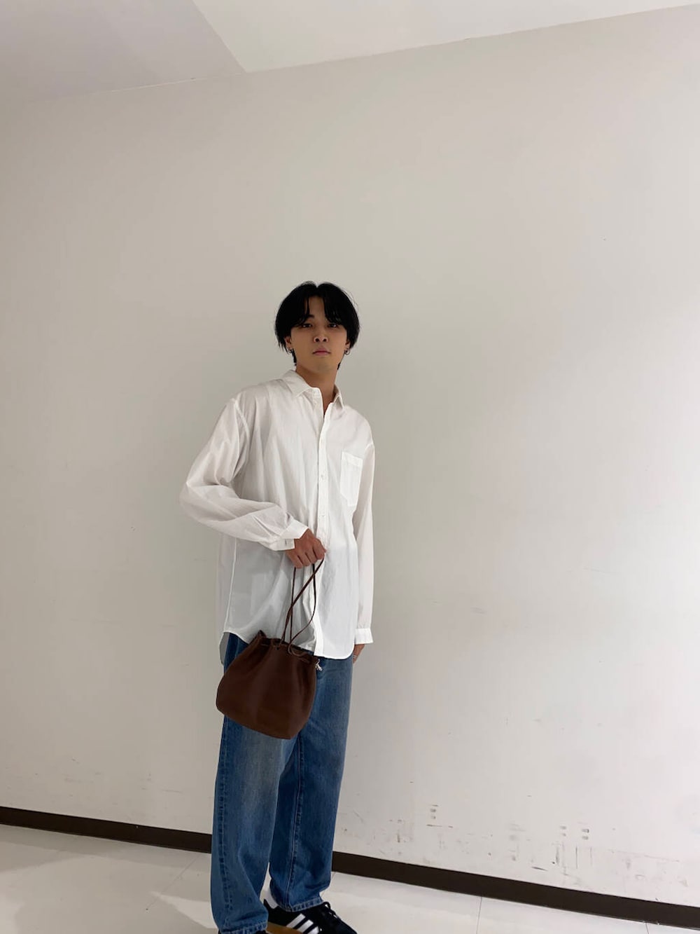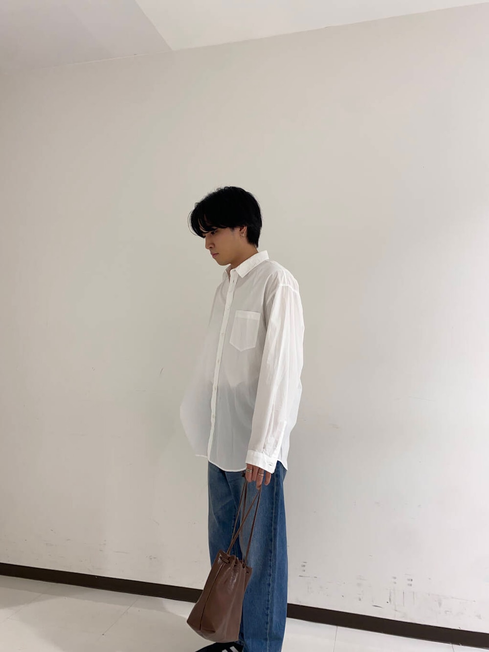 今回は定番の白シャツで合わせました!薄い生地がだす程よい透け感と、程よいシワが出すビンテージ感がデニムとの相性抜群です!