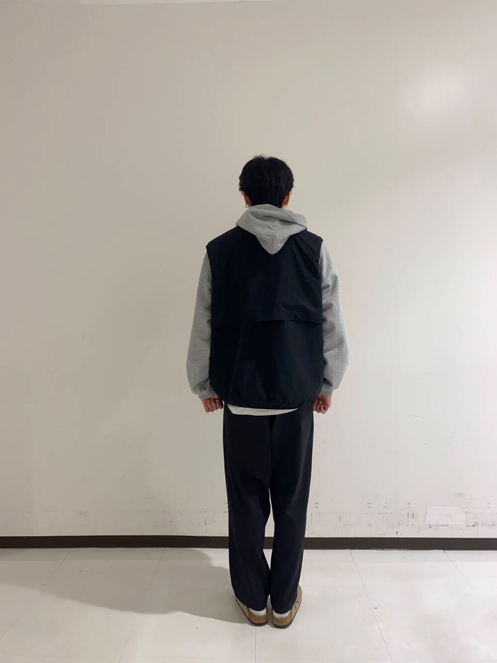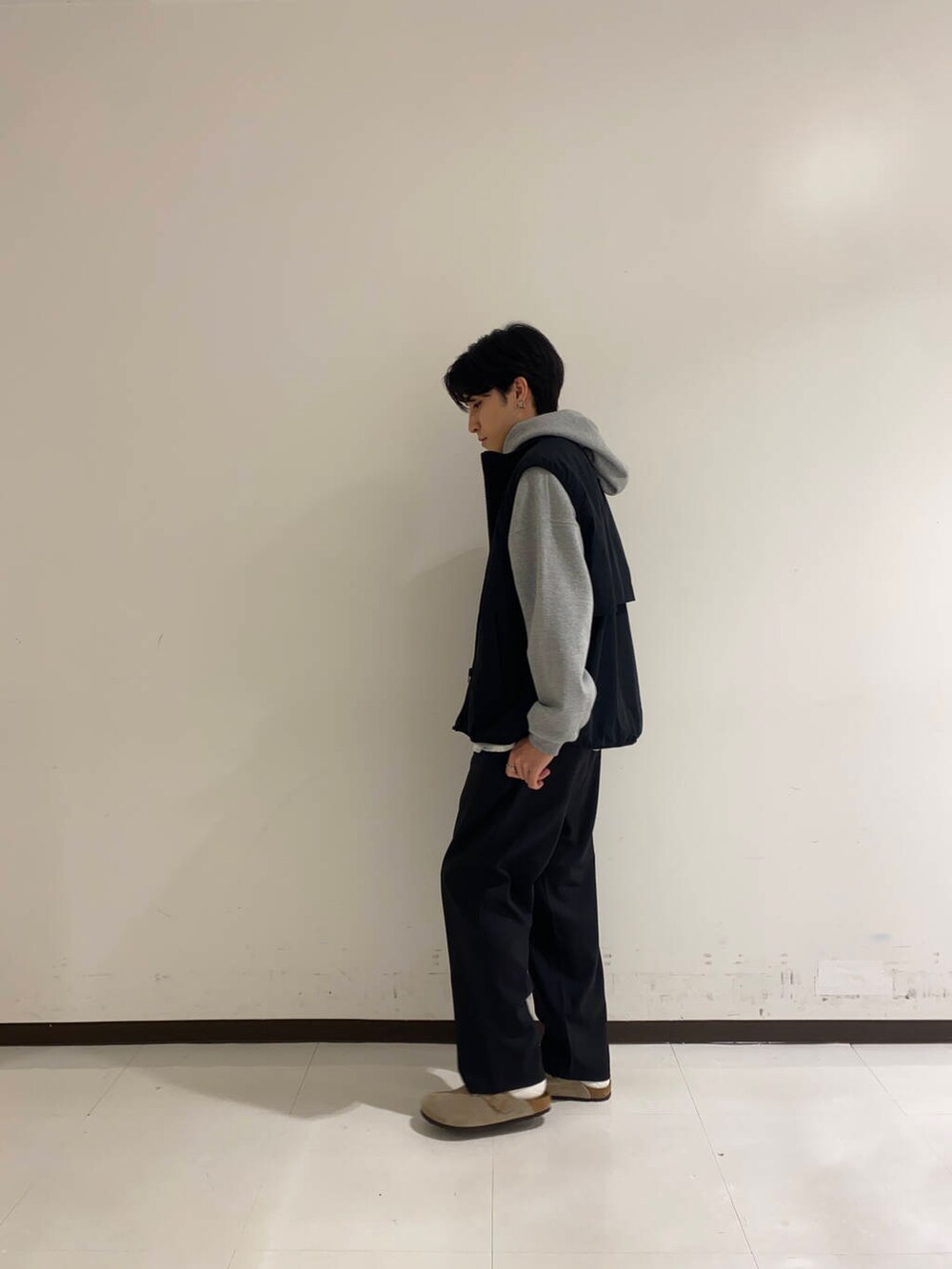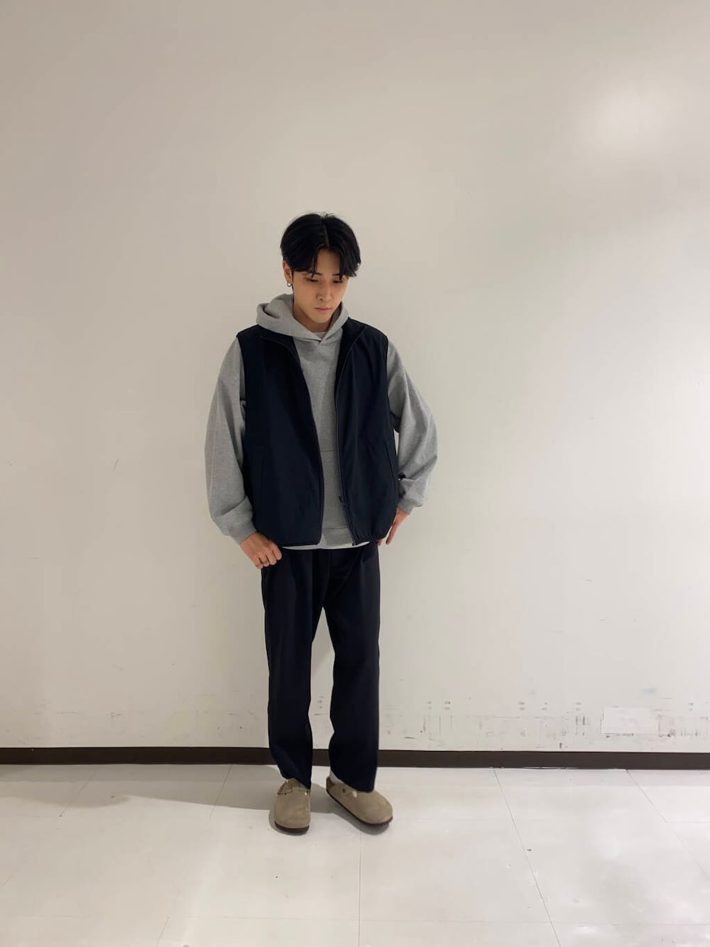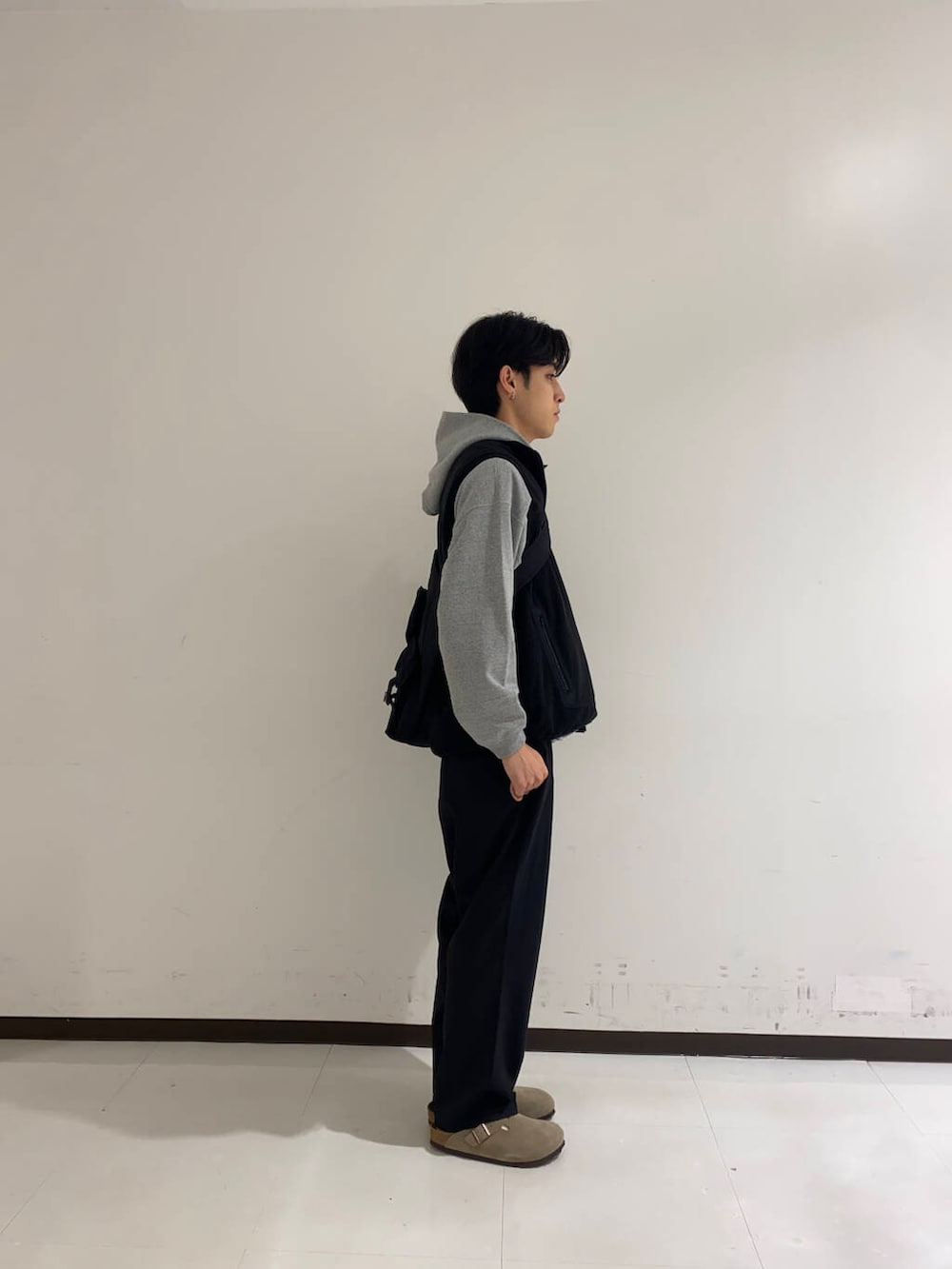 今回はダウンベストとおなじwide dadのスラックスで合わせました。パーカーだけだとシンプルになりがちですが、ベストを足すことでオシャレ感が格段に上がります!