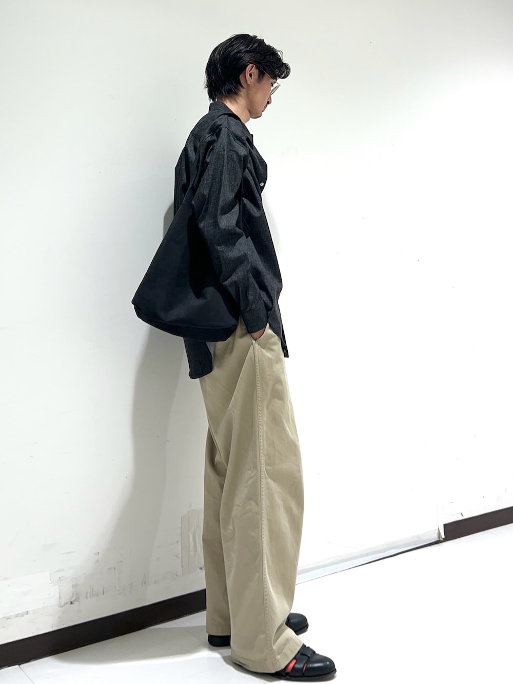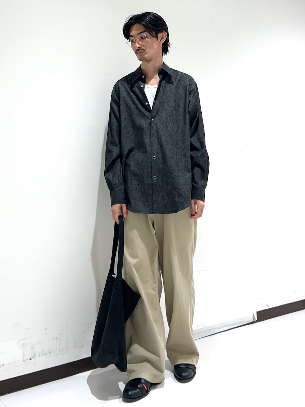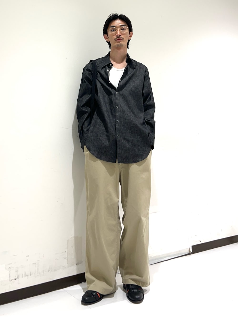 URらしくシックに合わせるなら、という合わせを、私物のチノパンで。淡いブルーのシャンブレーシャツなんかはよく見つかりますが、ブラックのデニムシャツは、なかなか貴重かと。