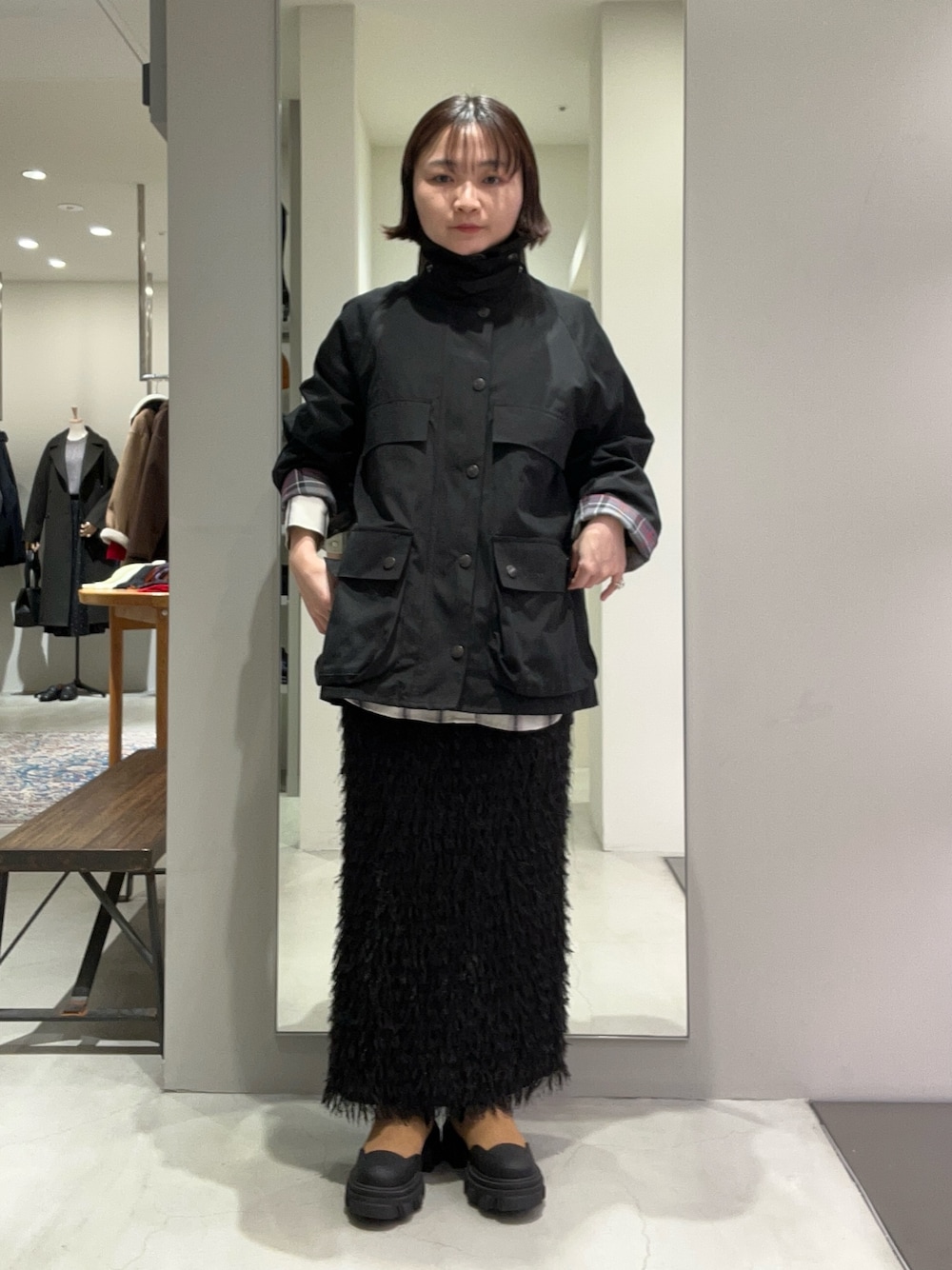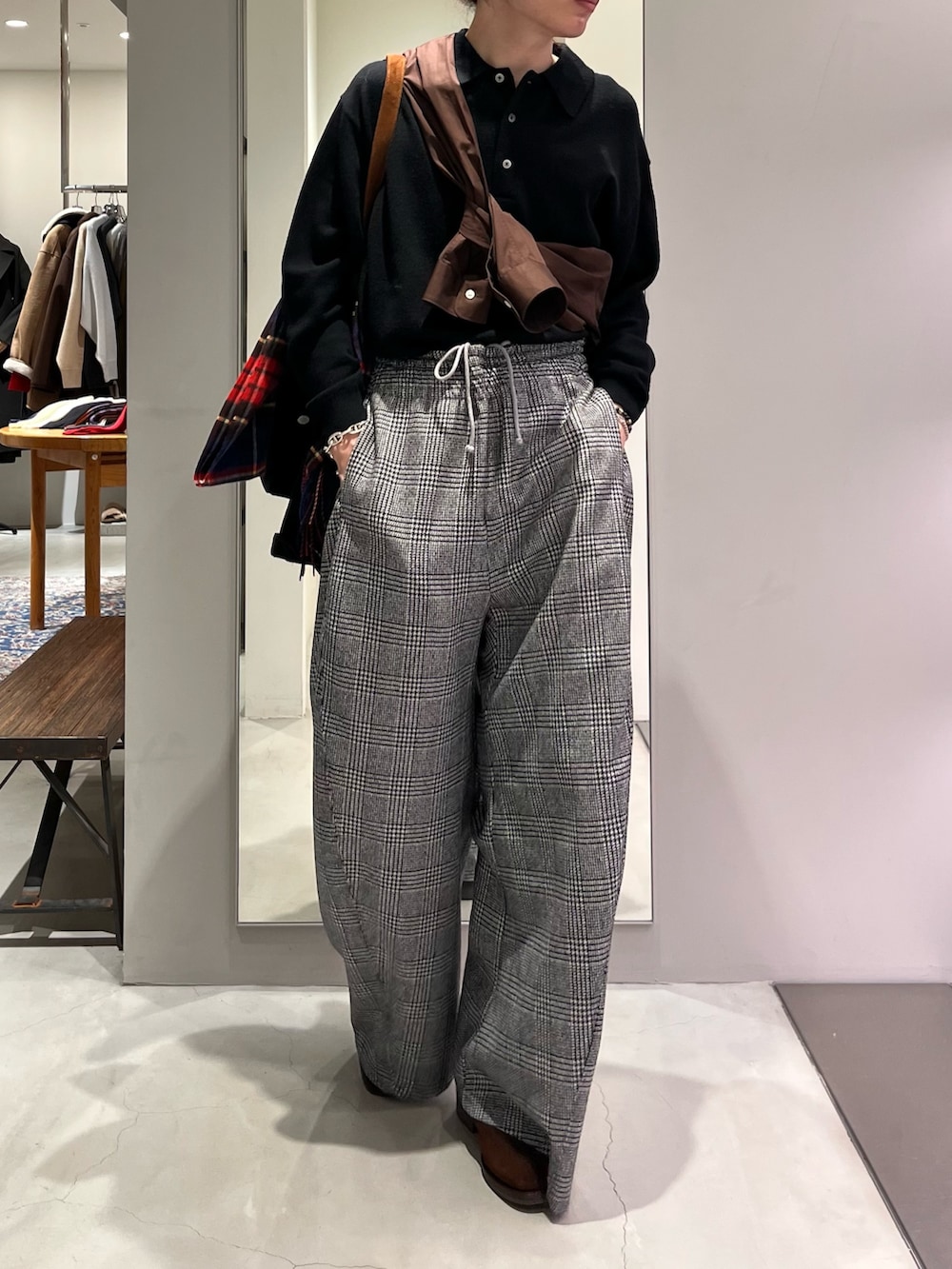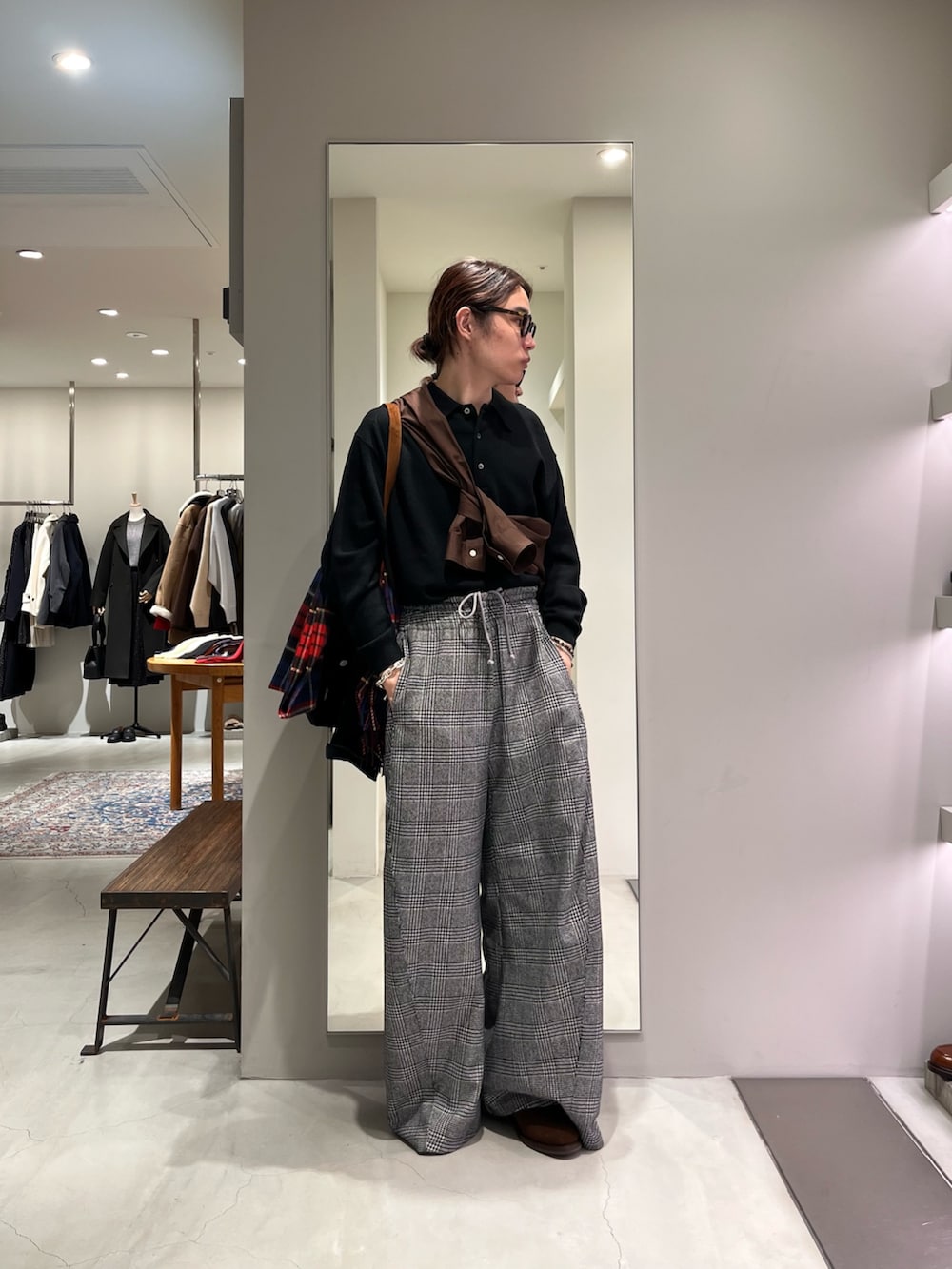 ポイントはトップスとジャゲット共のブラックですが素材で差をつけたところと、マフラーのチェックとパンツのチェックを拾ってるところです!