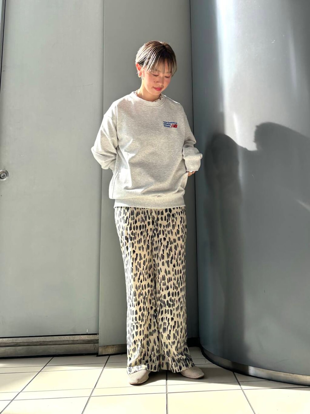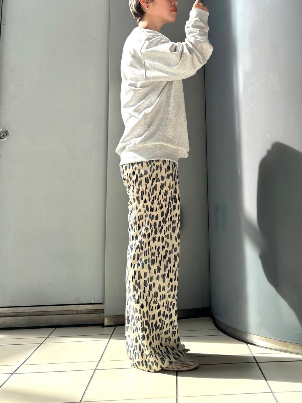 ライトグレーは重くならず、フェミニンなアイテムとの相性も良いです。
