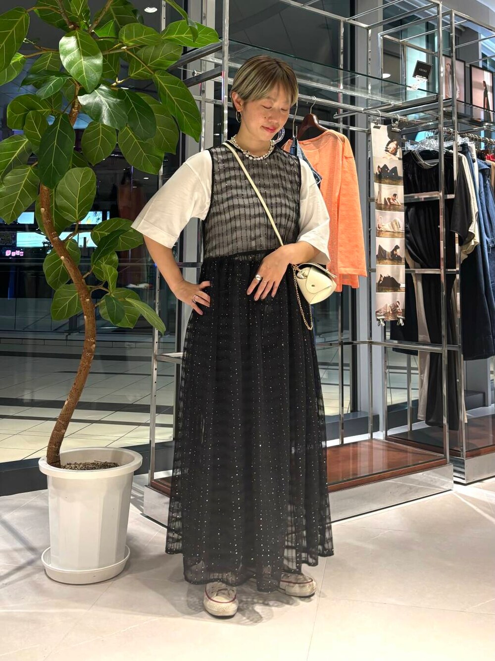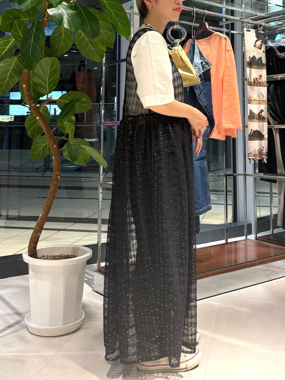 Tシャツとデニムのシンプルな組み合わせも、ワンピースをプラスして華やかに。