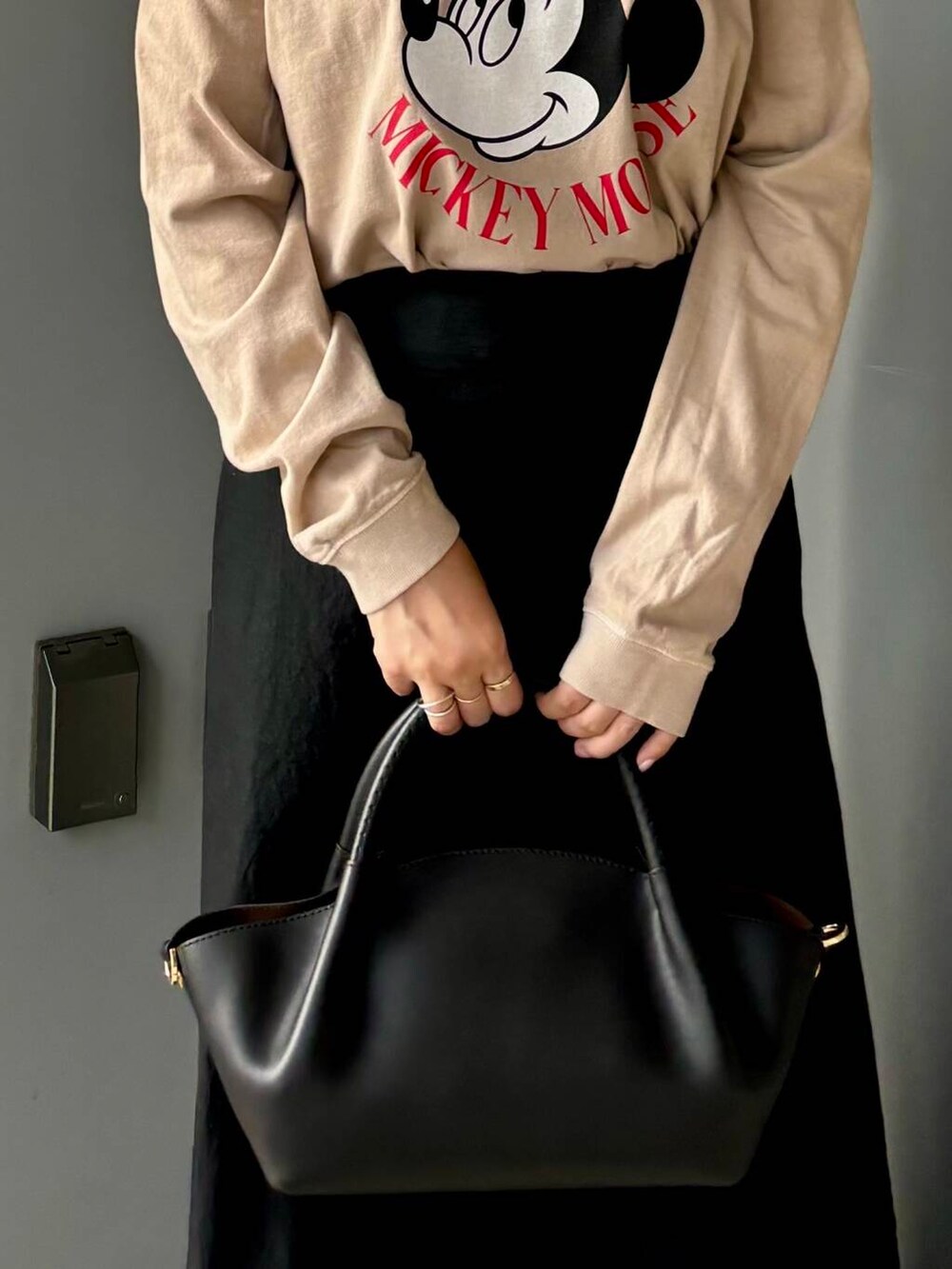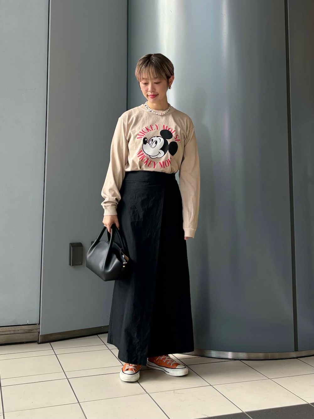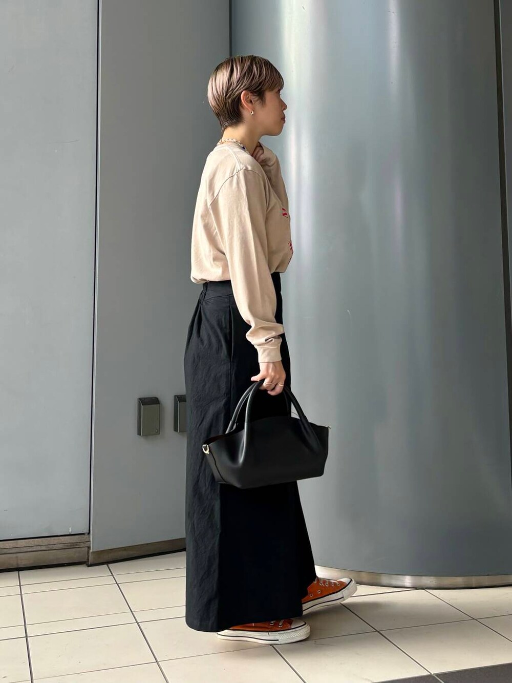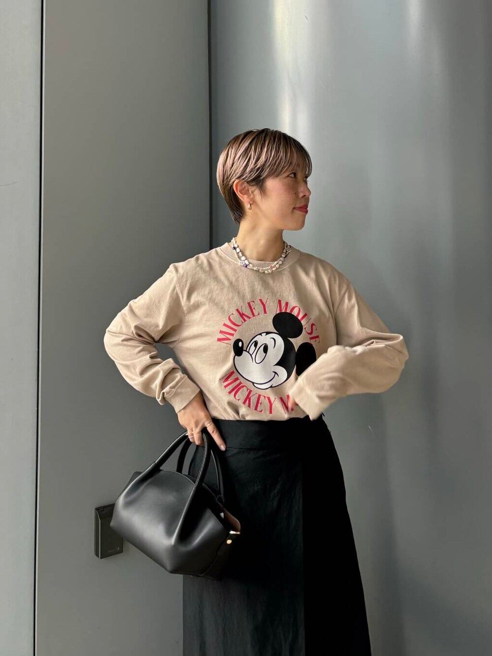 ナチュラルになりすぎない硬めの素材なのでローファーなどと合わせてかっちり目なスタイリングにも可愛いです。