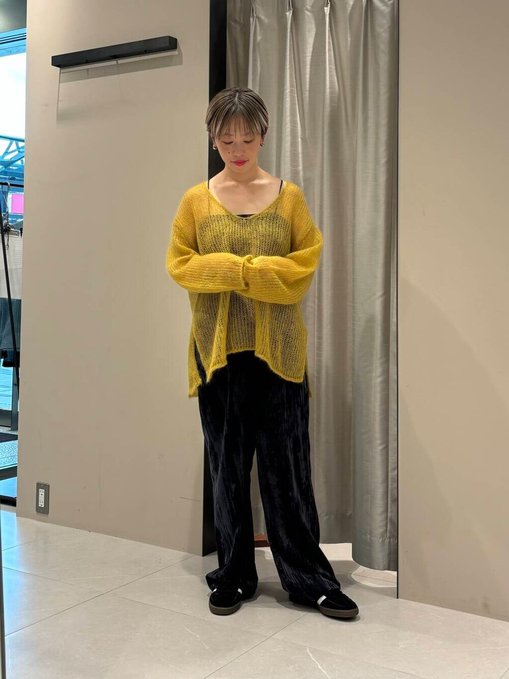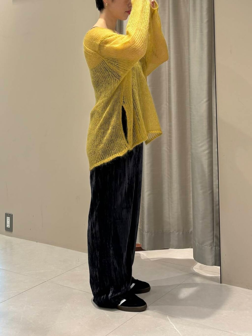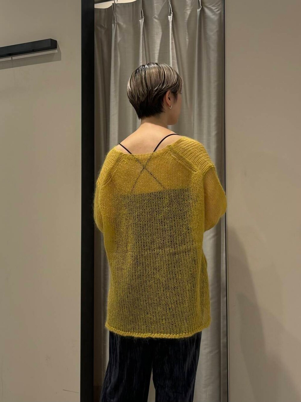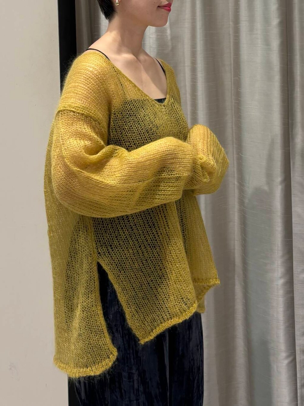 ローゲージでシアー感も強いので、中に柄やロゴを着て透け感を楽しむのもおすすめです。
