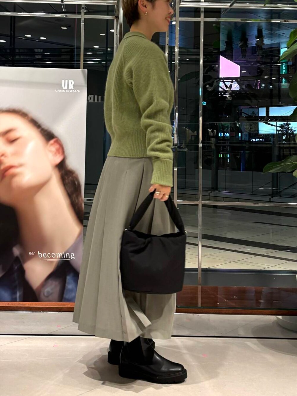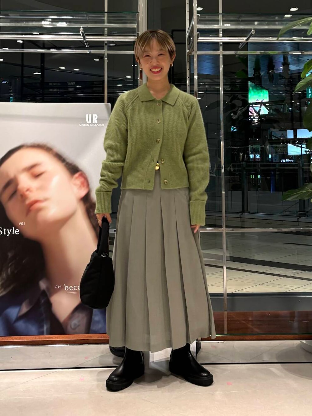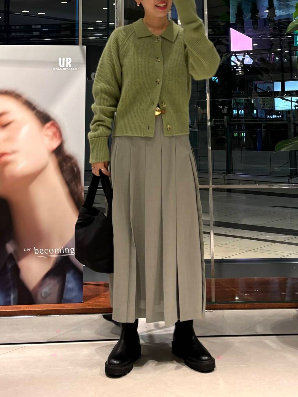 幅のあるプリーツなので、広がりすぎずに着ていただけます。クラシックな印象でブーツにも合わせやすい着丈です。