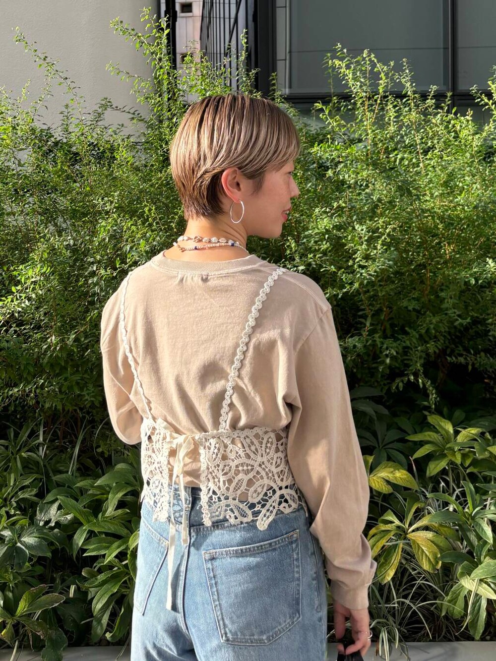 後ろのリボンでサイズ感も調節できるので、中には多少ボリュームのあるものも着ていただけます。