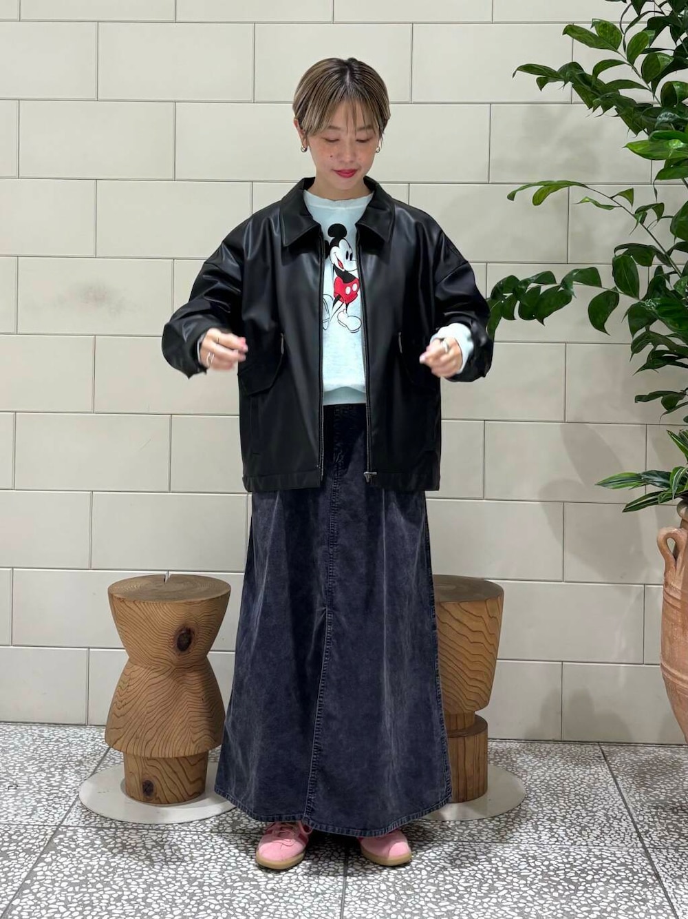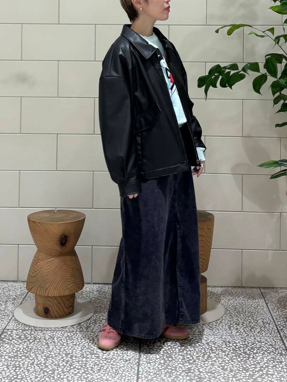 レザーアウターはハンサムな雰囲気にもなりますが、こちらは襟が可愛い印象に…