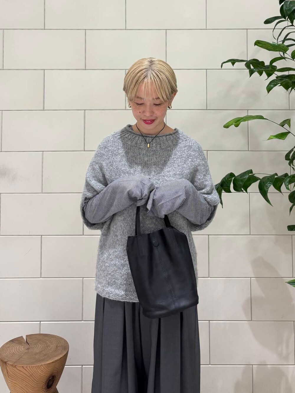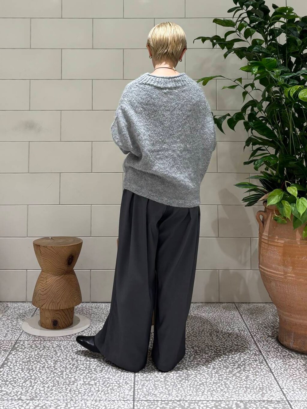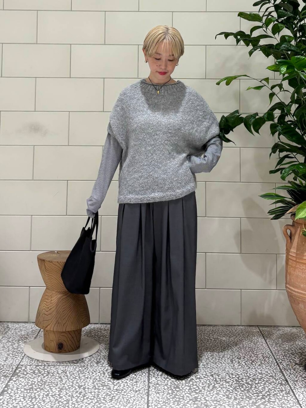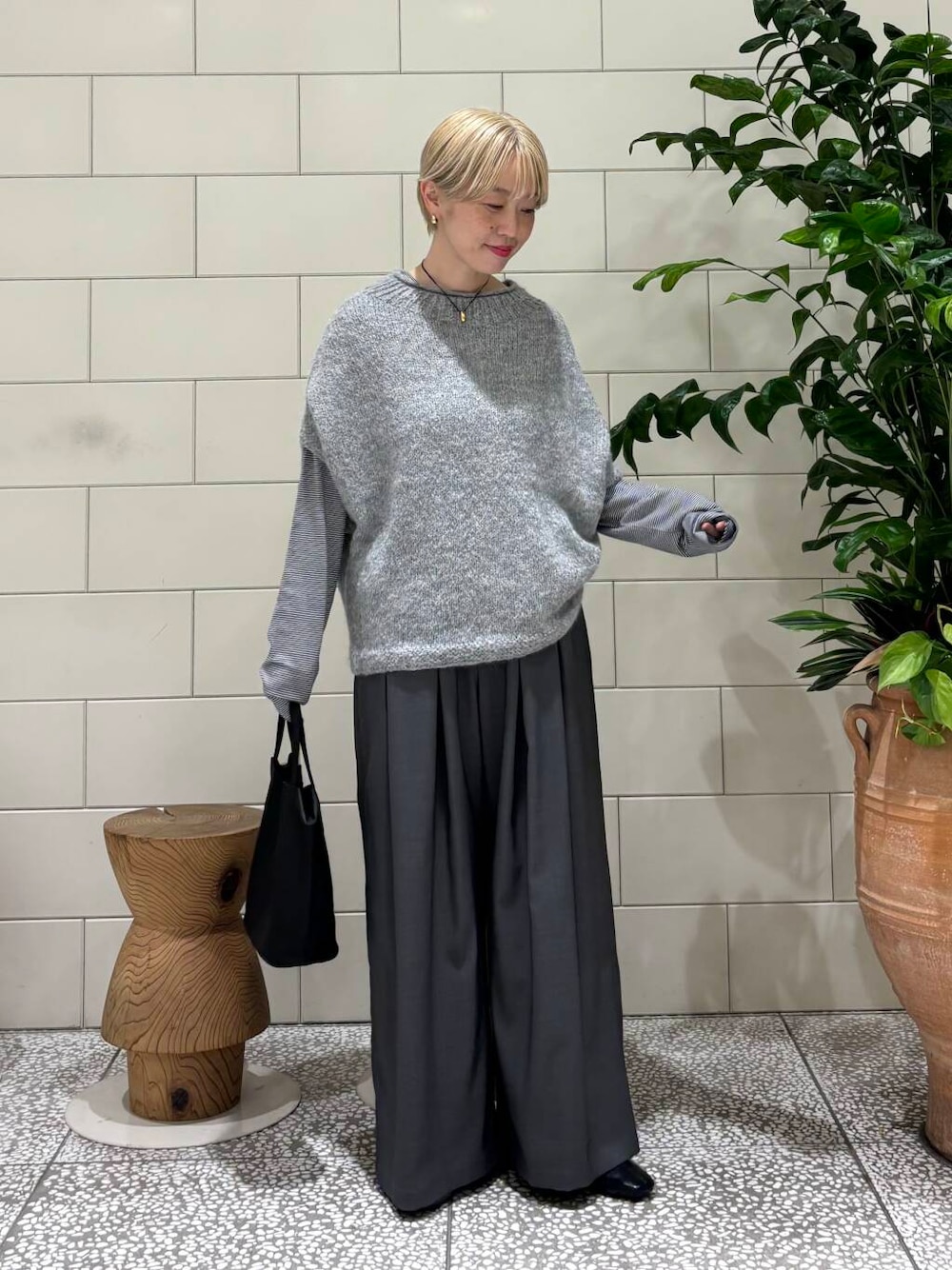ワイドですが、キレイめ素材のおかげでキレイめカジュアルなスタイリングに仕上がります。