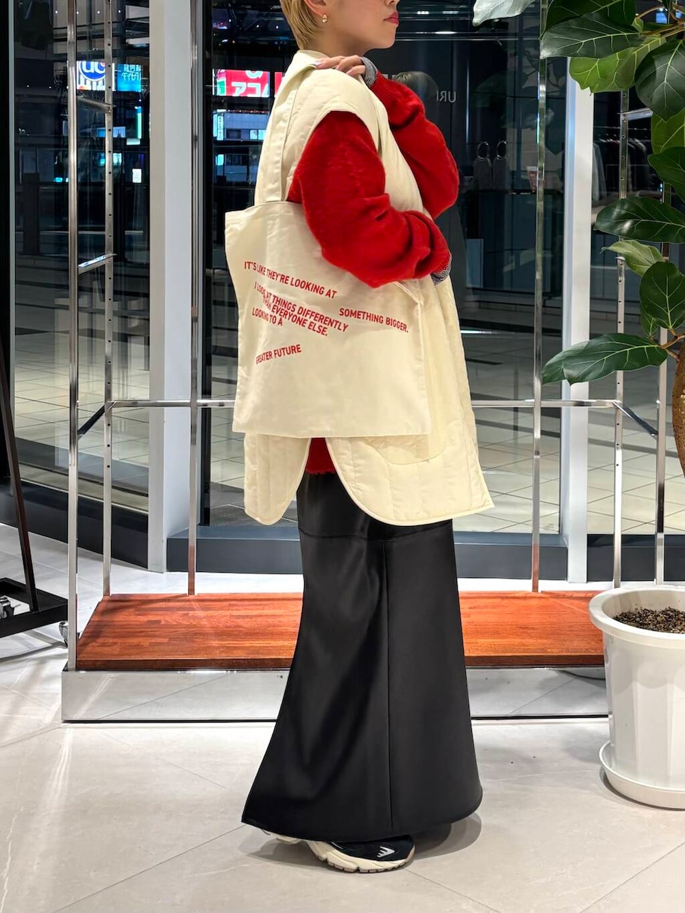 形はシンプルですが、素材でトレンド感を取り入れていただけます。着丈長めで、私の身長(158cm)ではこの写真はウエストを1つ折って着ています。