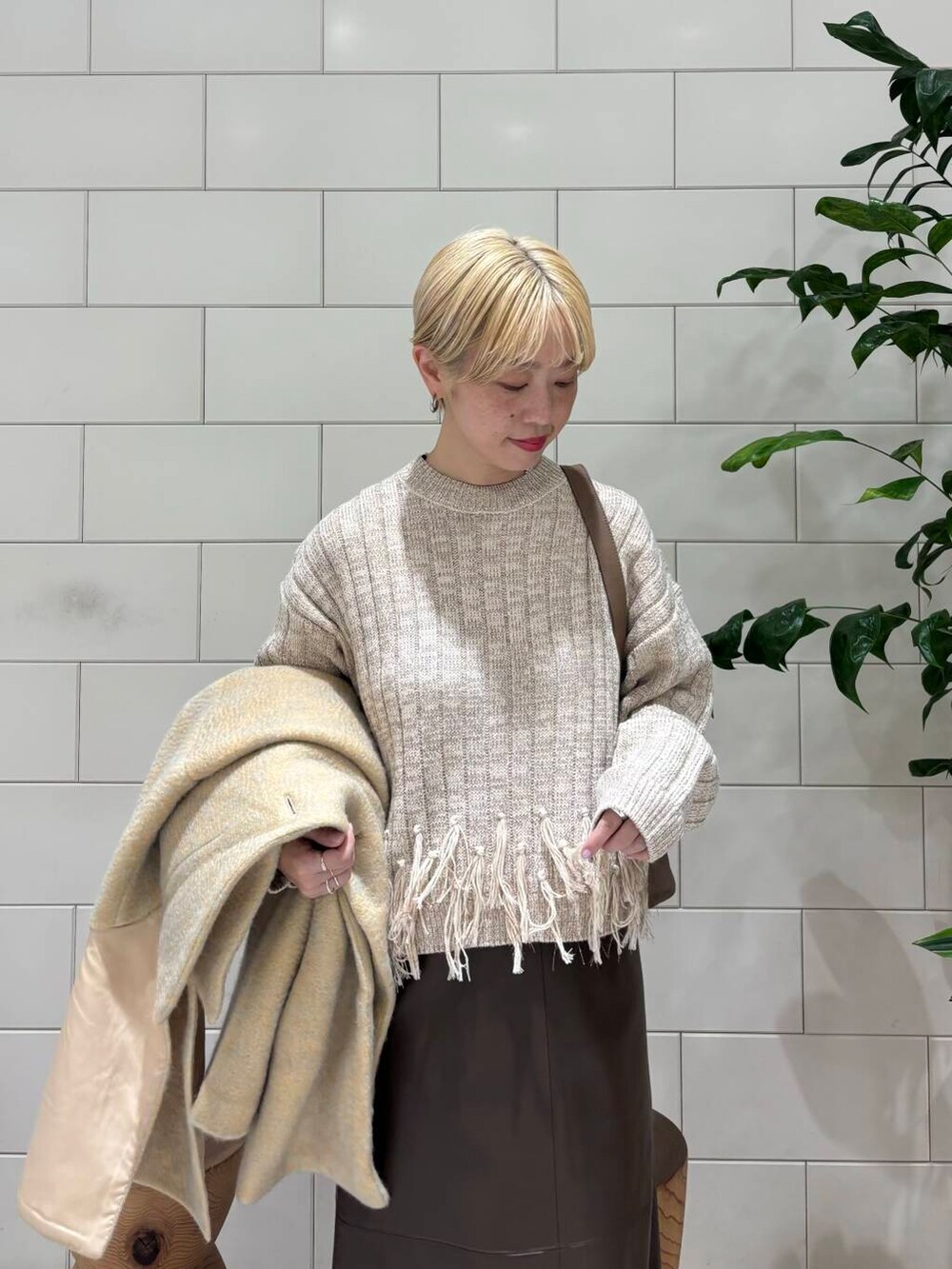 ポイントのフリンジやラメ糸を使った華やかなニットです。