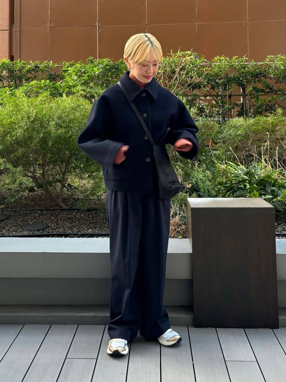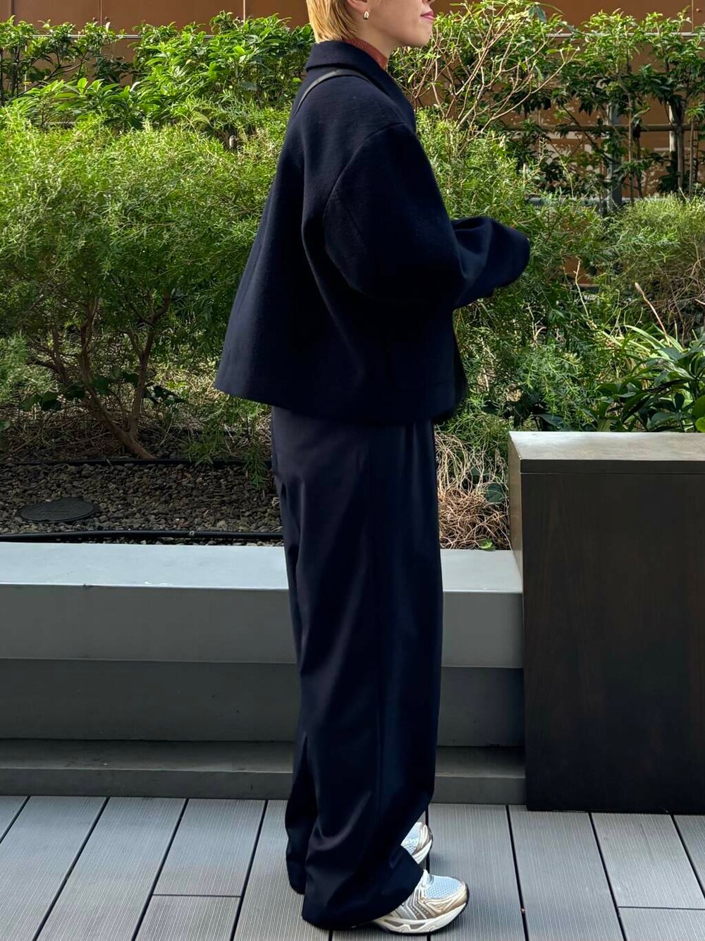 スラックスの綺麗めな形でもややワイドで裾にたまるシルエットがオシャレです。