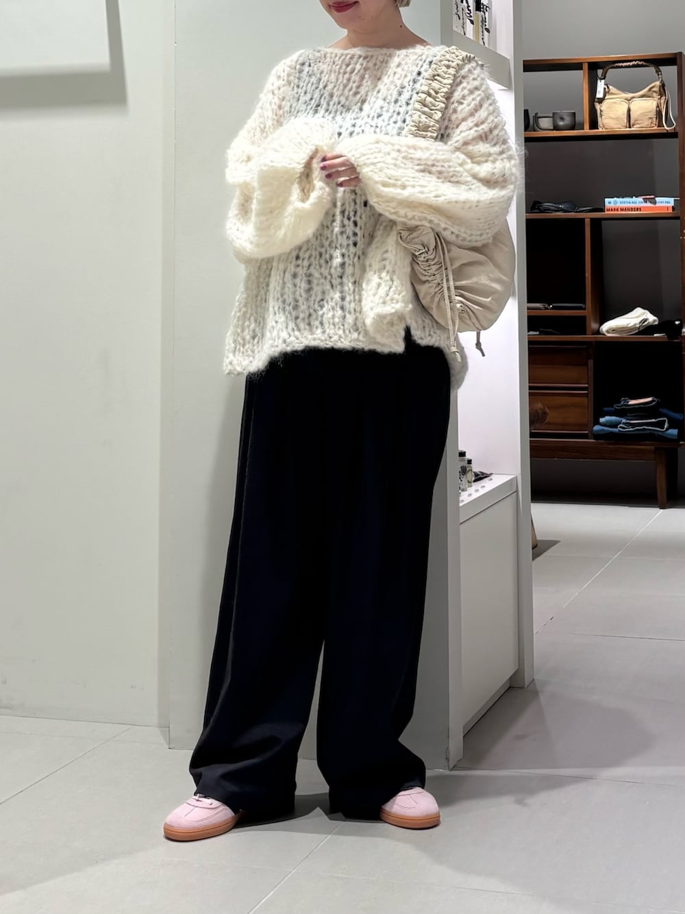 ざっくり編まれたシルエットがフェミニンなニット。シアー感もあるので、今の時期はタンクやキャミで合わせても◎