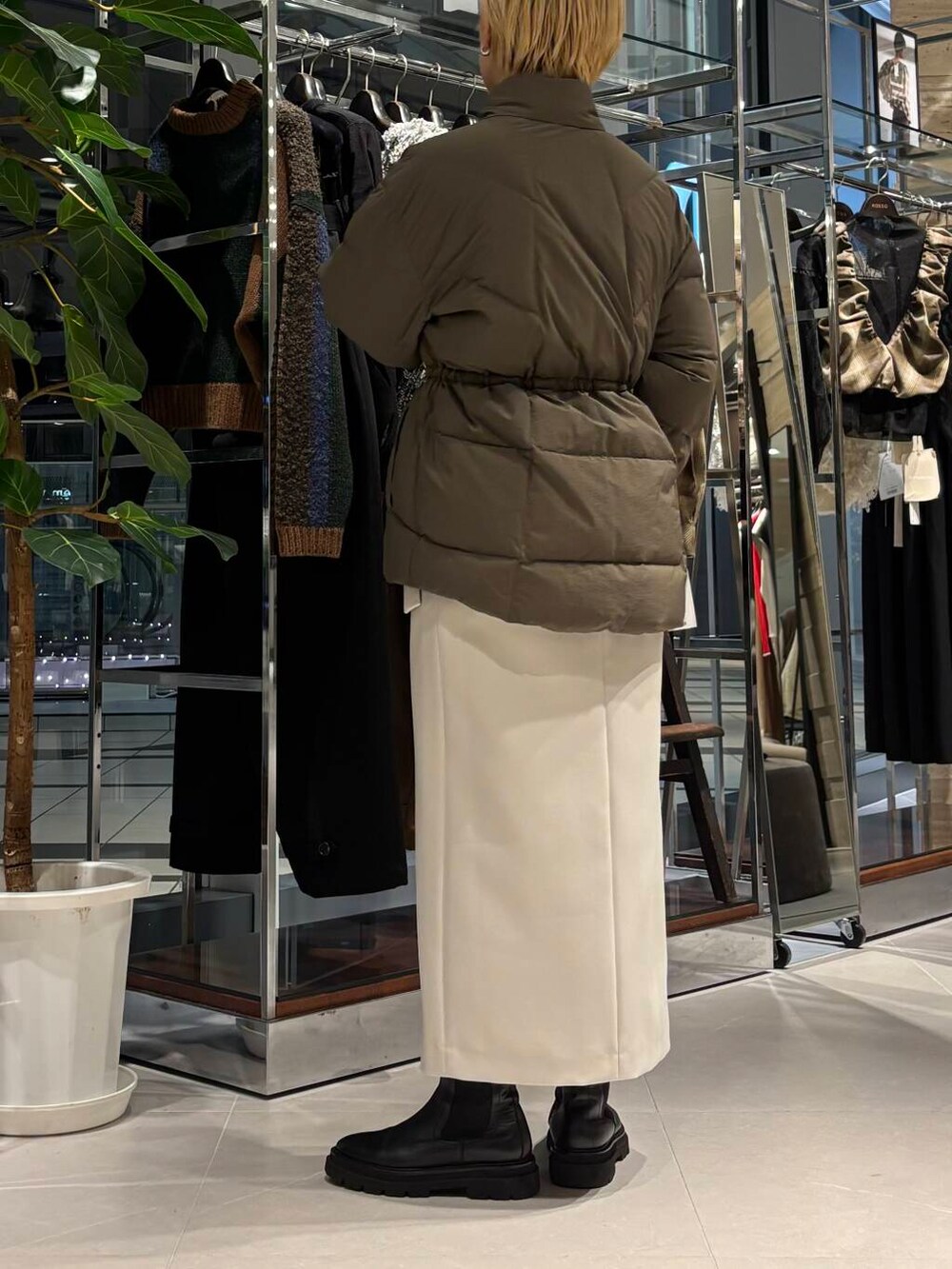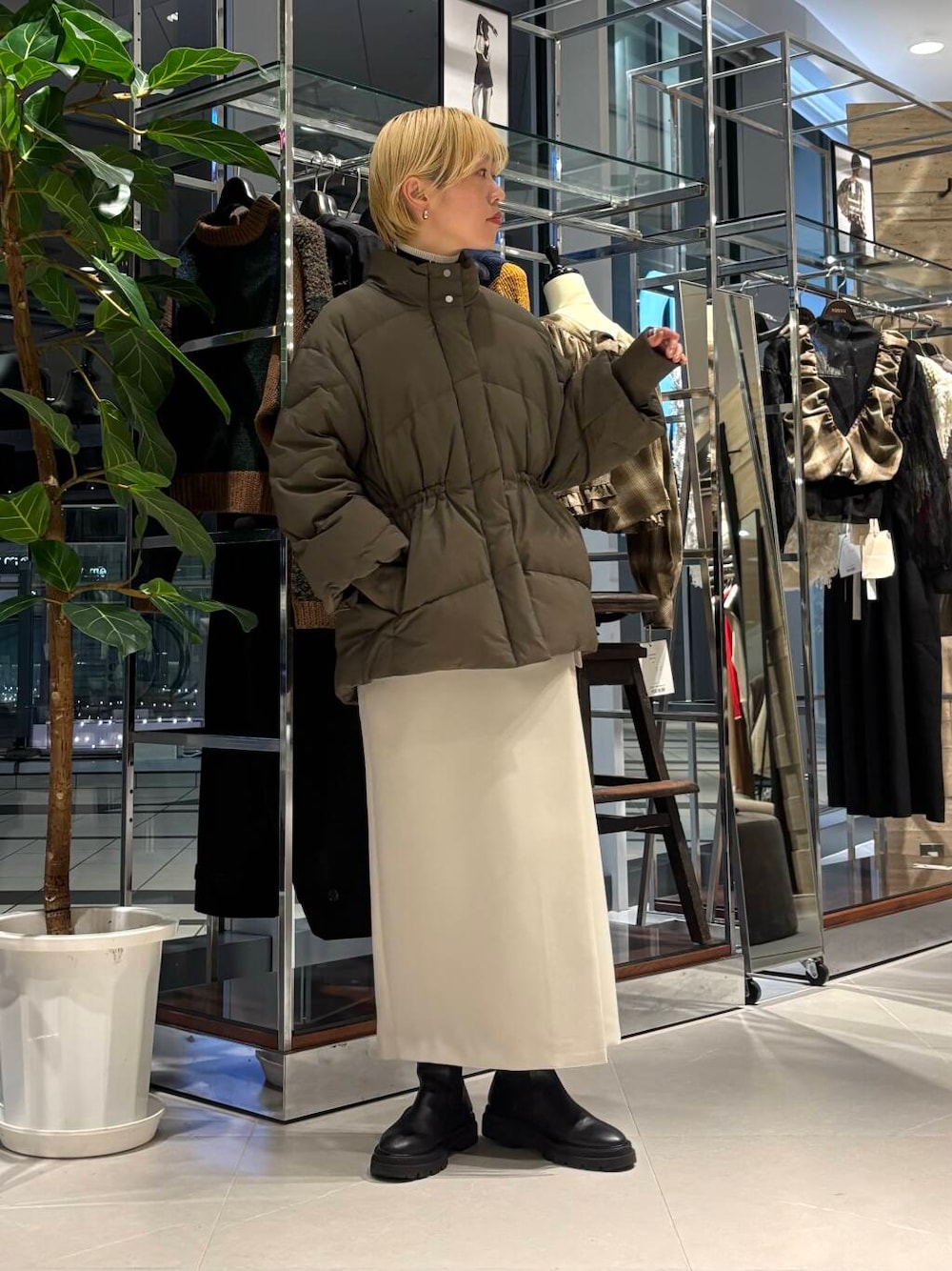 ウエストの絞れるダウンは着膨れせず、それでいてカジュアルにもなりすぎません。