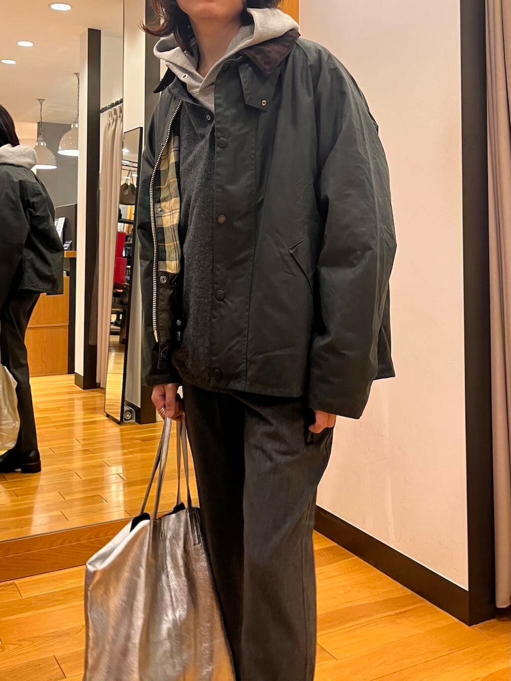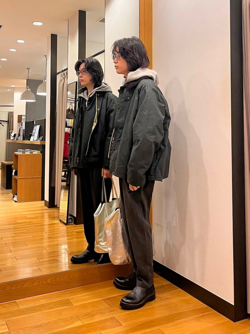 wide dadのパーカーにカシミヤヘンリーネックレイヤード!