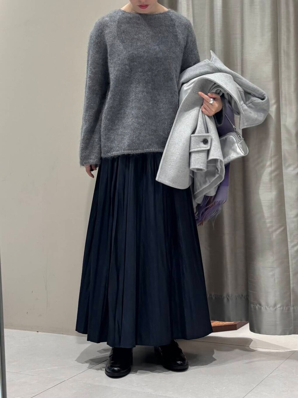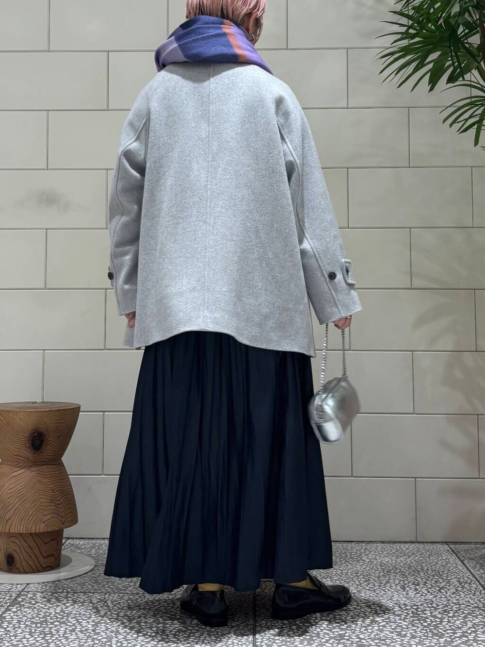 淡いグレーがフェミニンなコーディネートにも使いやすいです。