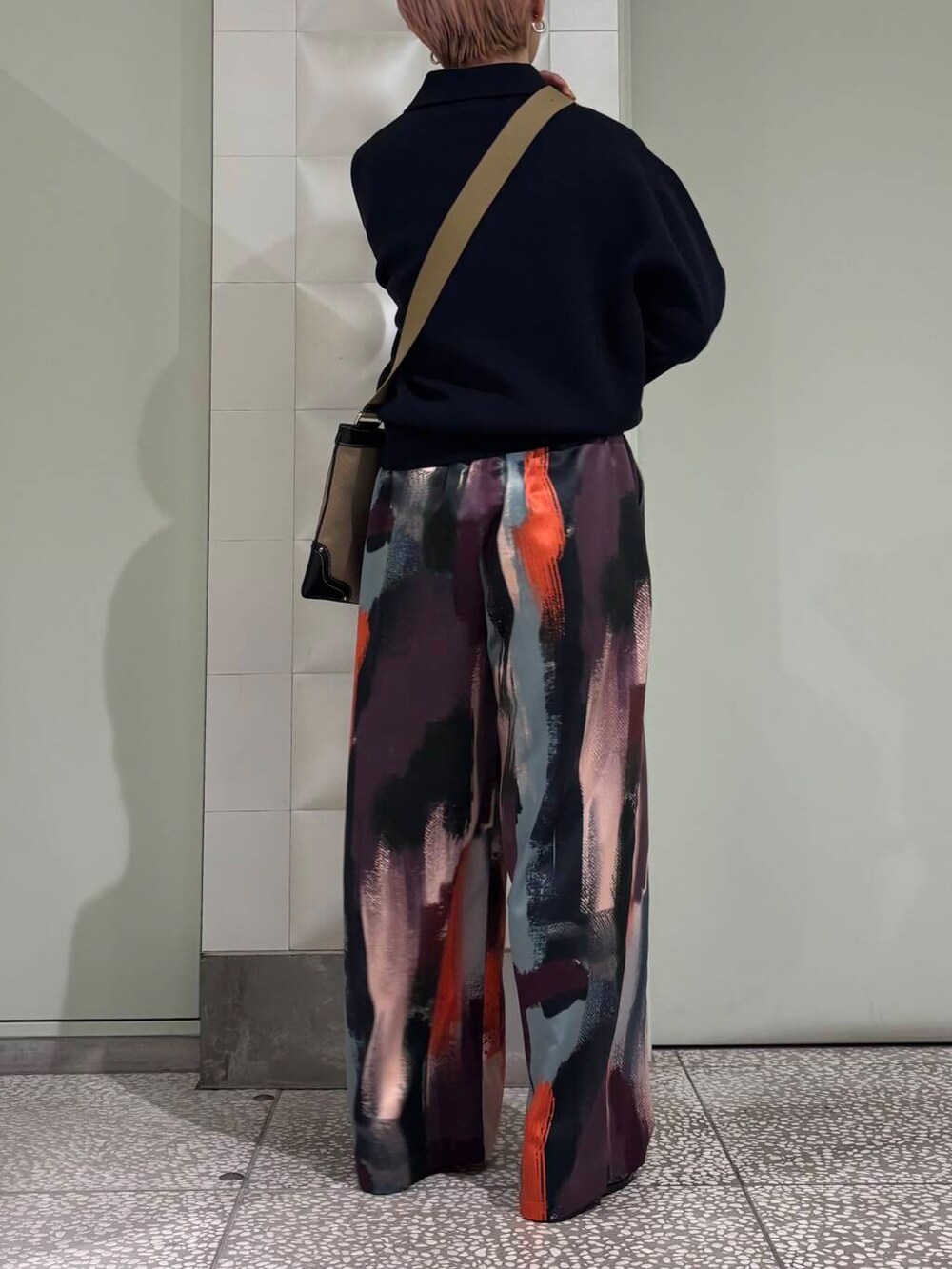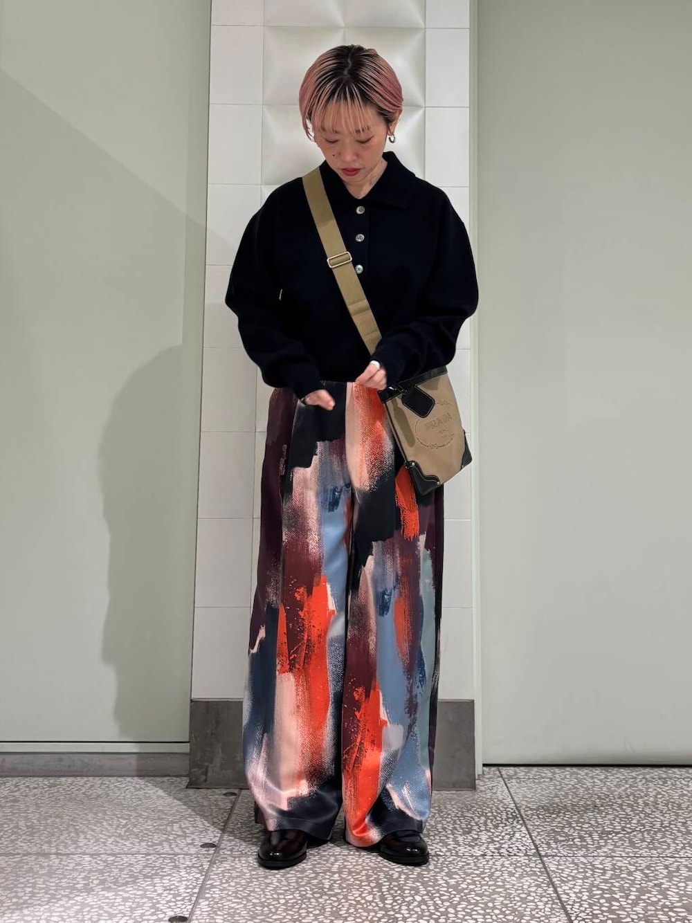 シンプルなスタイリングも一気におしゃれに仕上がります。ピンク×ブラックですが、甘くならずメンズライクな印象です。