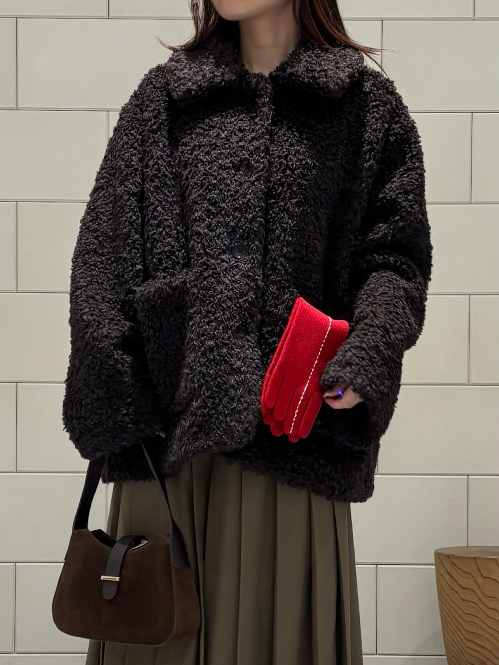 ボリュームが可愛いカーリーファーコートです。軽くて羽織りやすく今季の主役アウターになります。