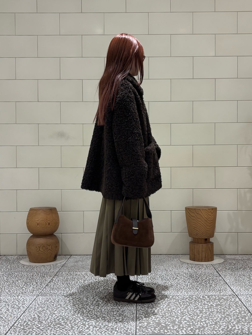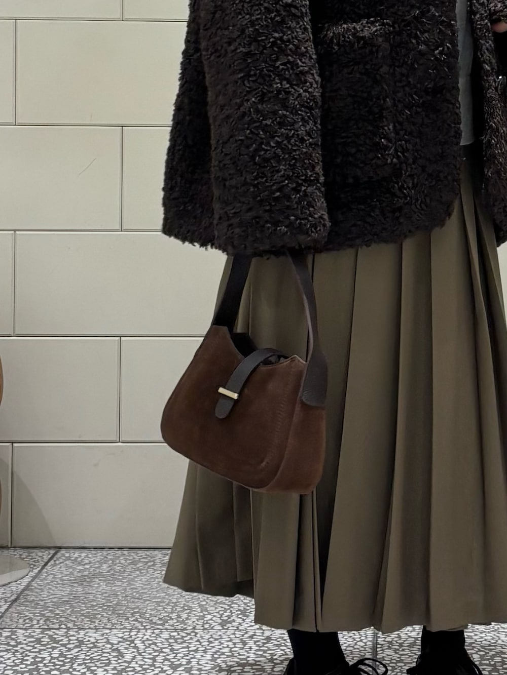 スウェード生地が季節感のあるブラウンバッグです。普段使いしやすい小ぶりなサイズ感が◎