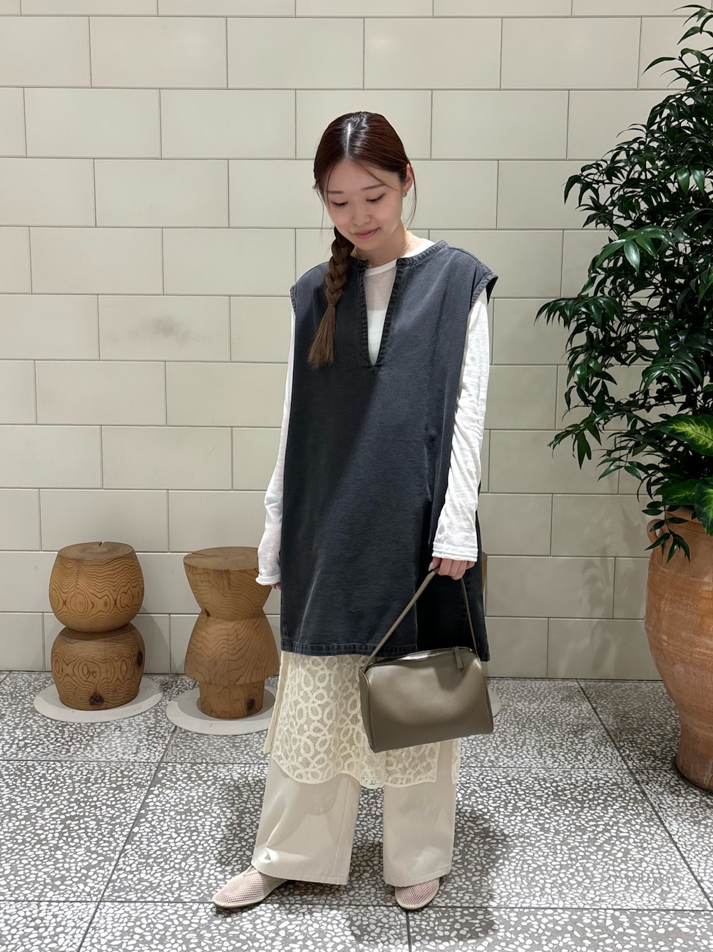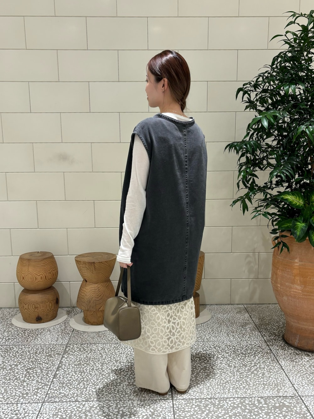 デニムジレは丈が長めでレイヤードスタイリングにおすすめです。