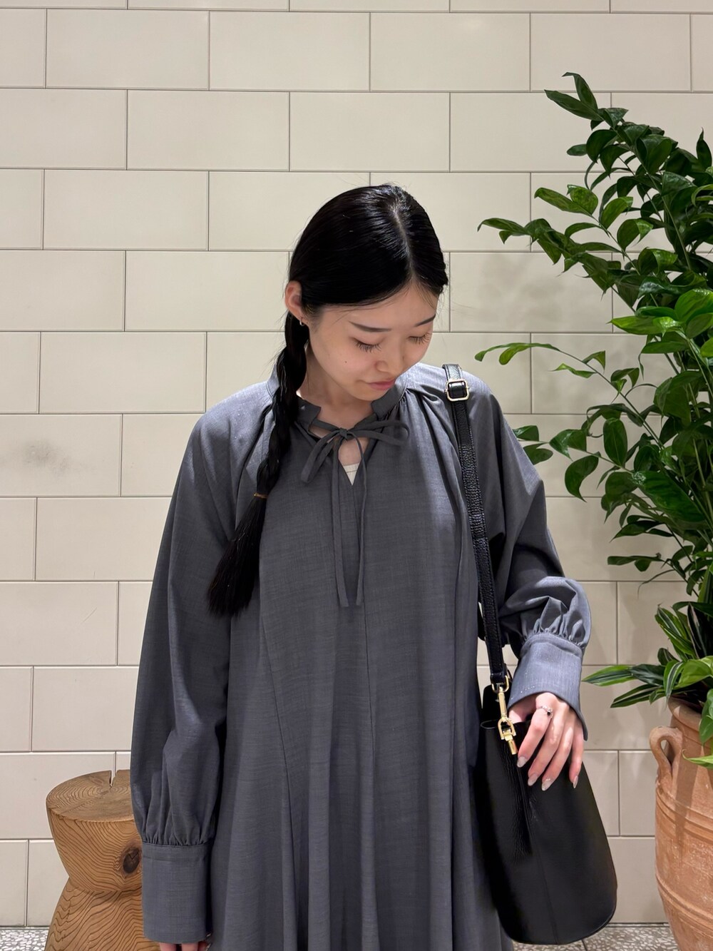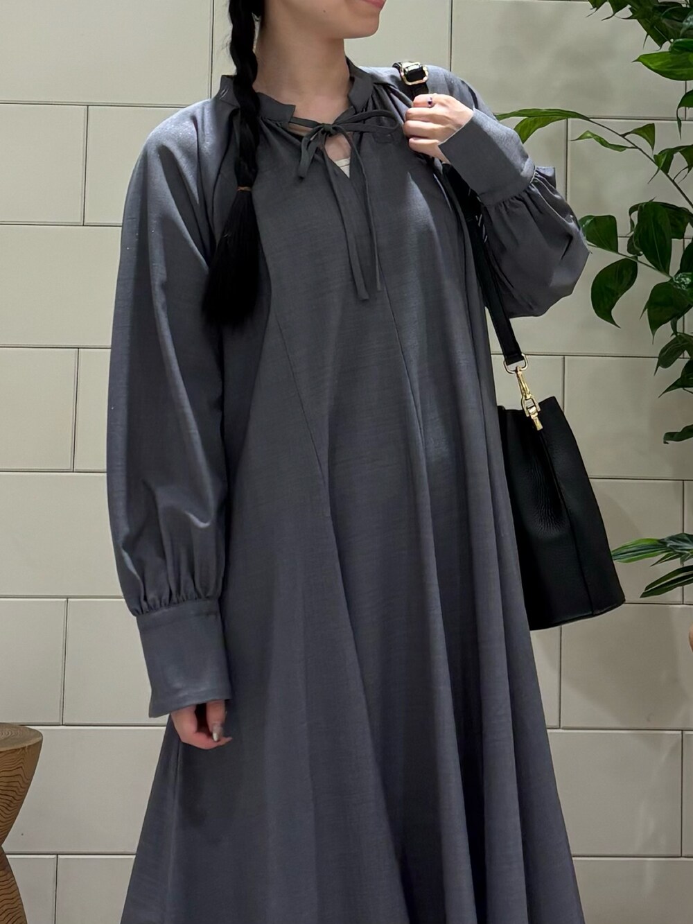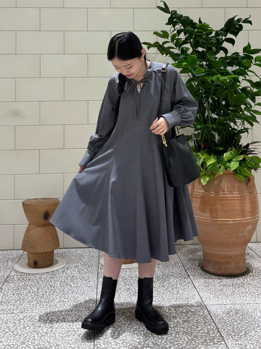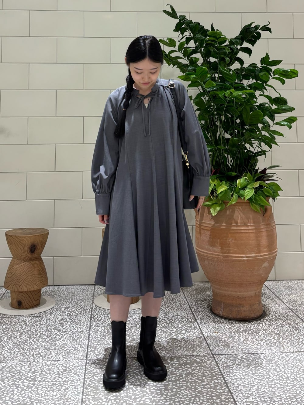 ドレープが大胆に出るワンピースです。ショートブーツでもロングブーツでも相性抜群です。155cmで膝下までくる丈感です。細かいラメが入っているので肉眼で見るとキラキラと光ります。