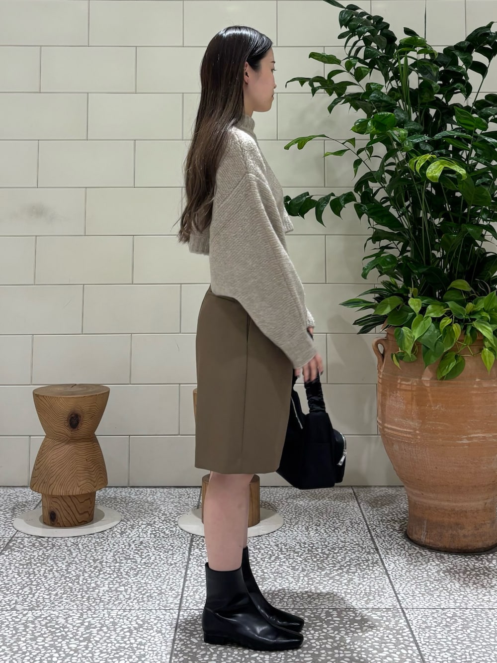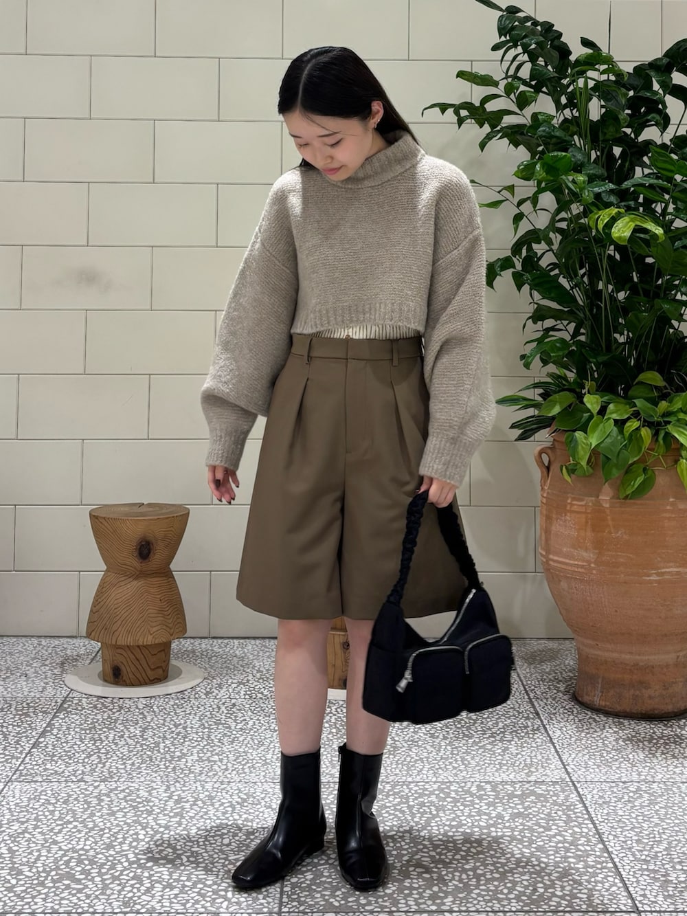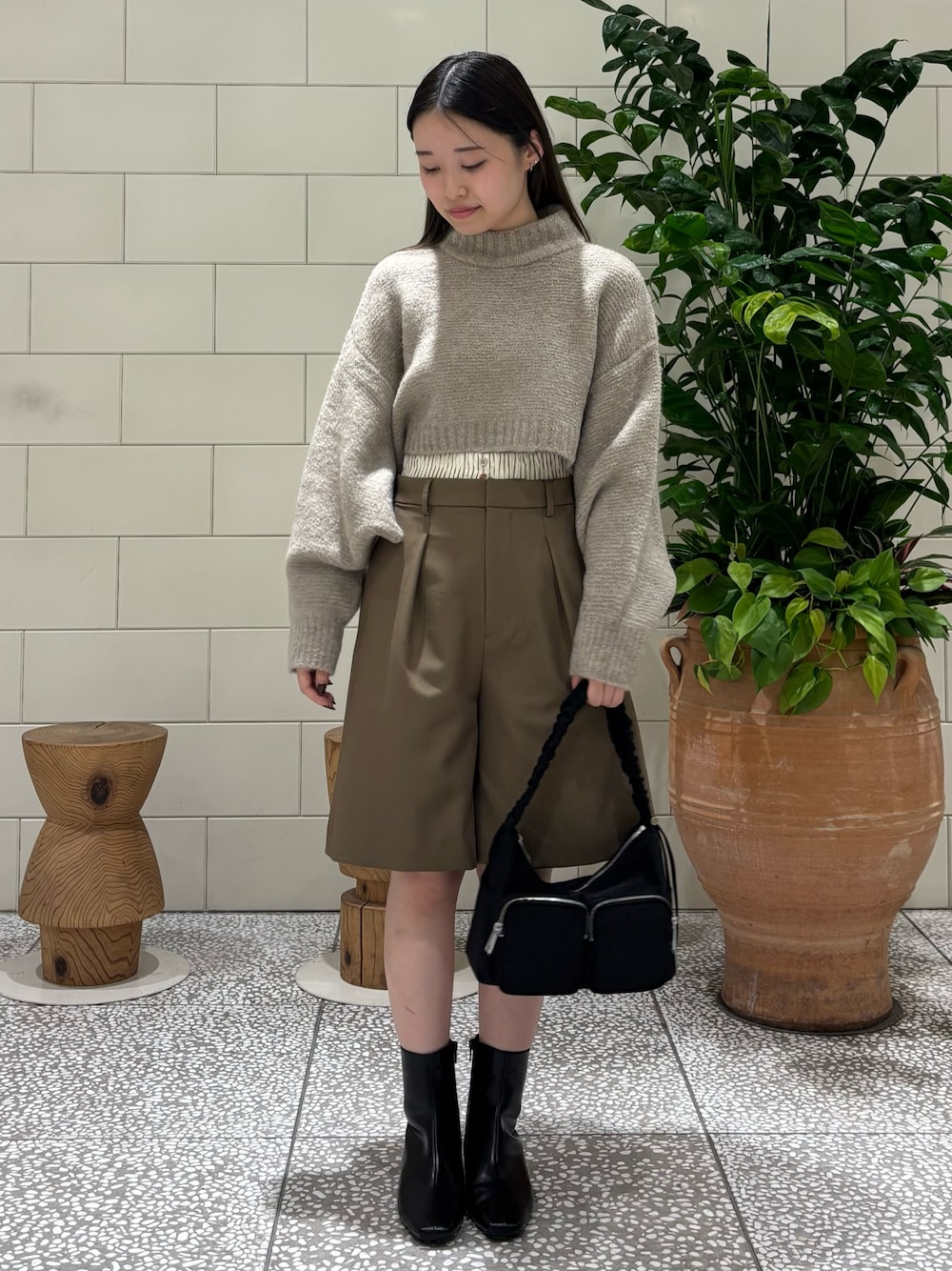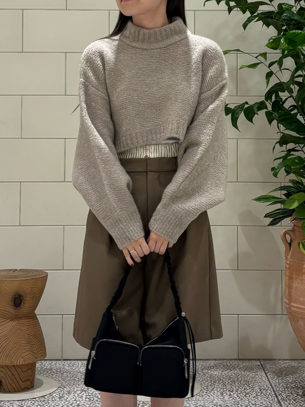 ショート丈のニットなので、スタイルアップ効果あります。キャミワンピースに合わせたレイヤードスタイルなどもおすすめです。