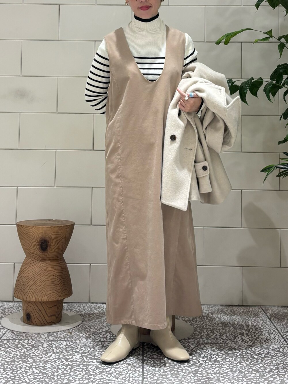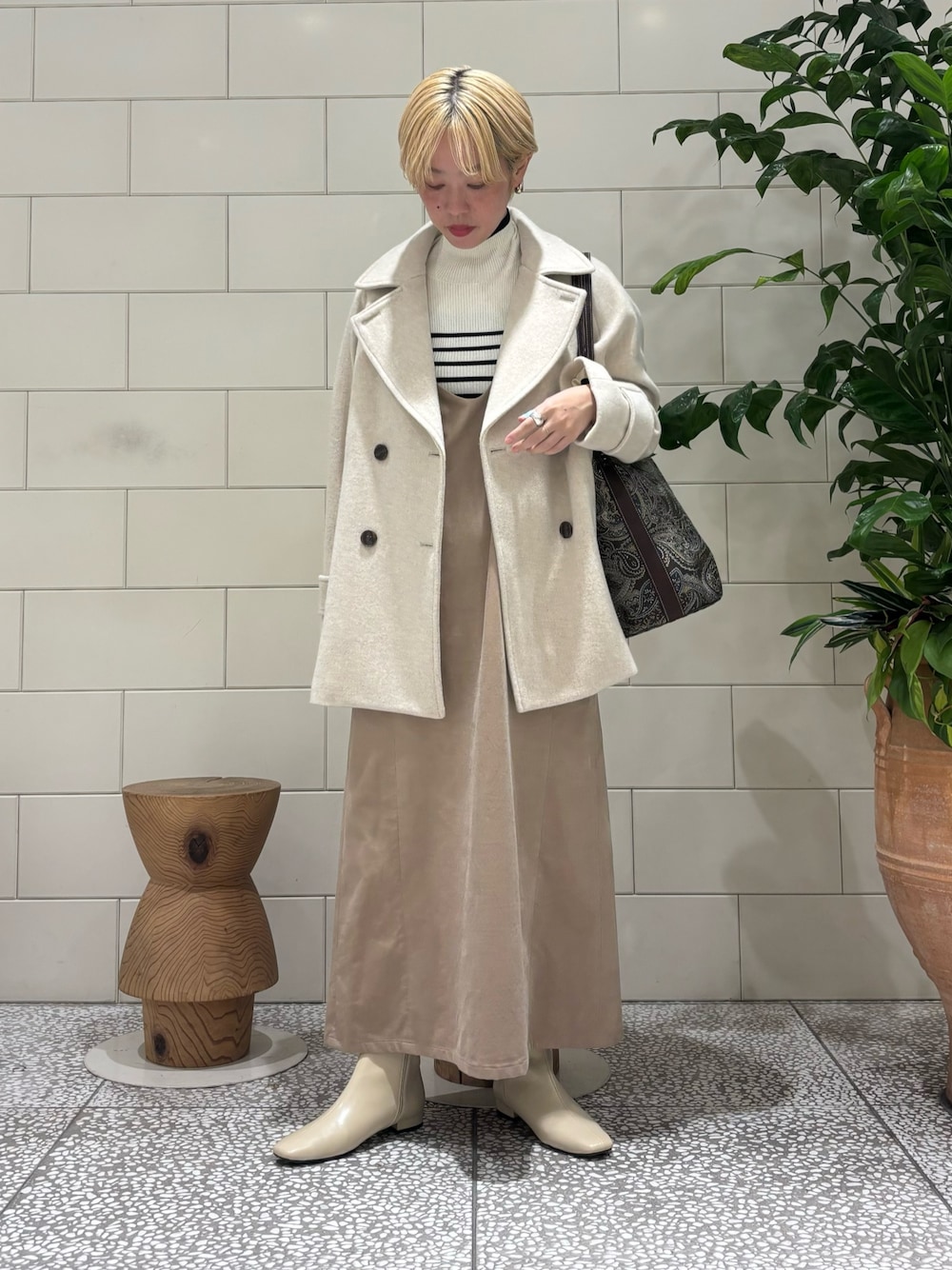 淡いベージュは冬のコーディネートを柔らかく仕上げてくれます。